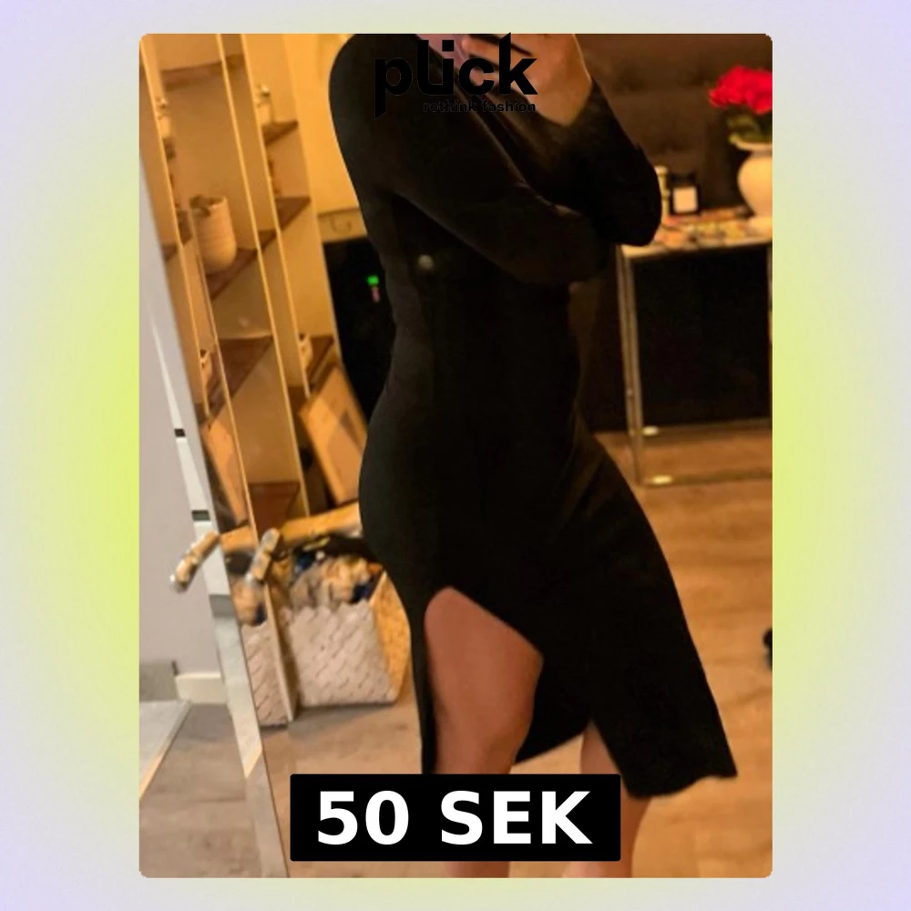 Stilren svart långklänning med långa ärmar och en snygg slits på sidan. Klänningen har en kroppsnära passform och rund halsringning,