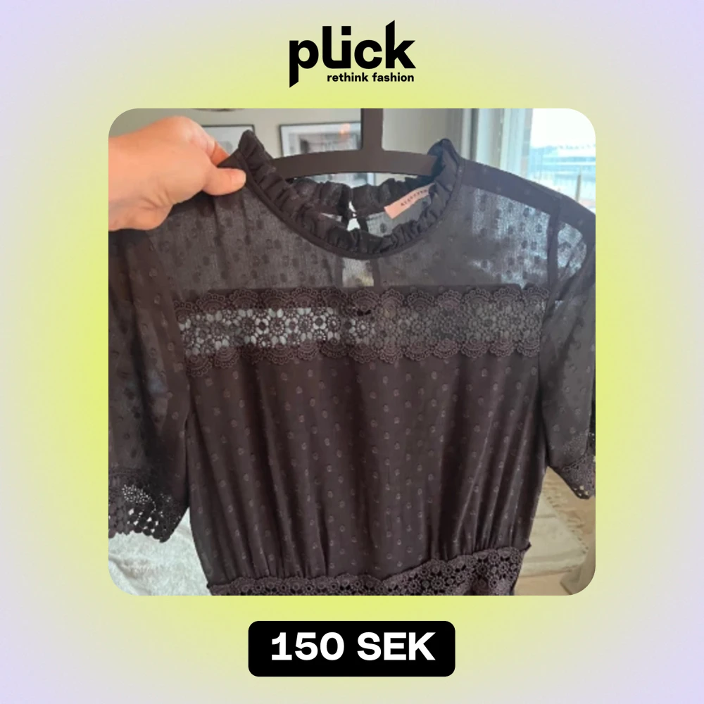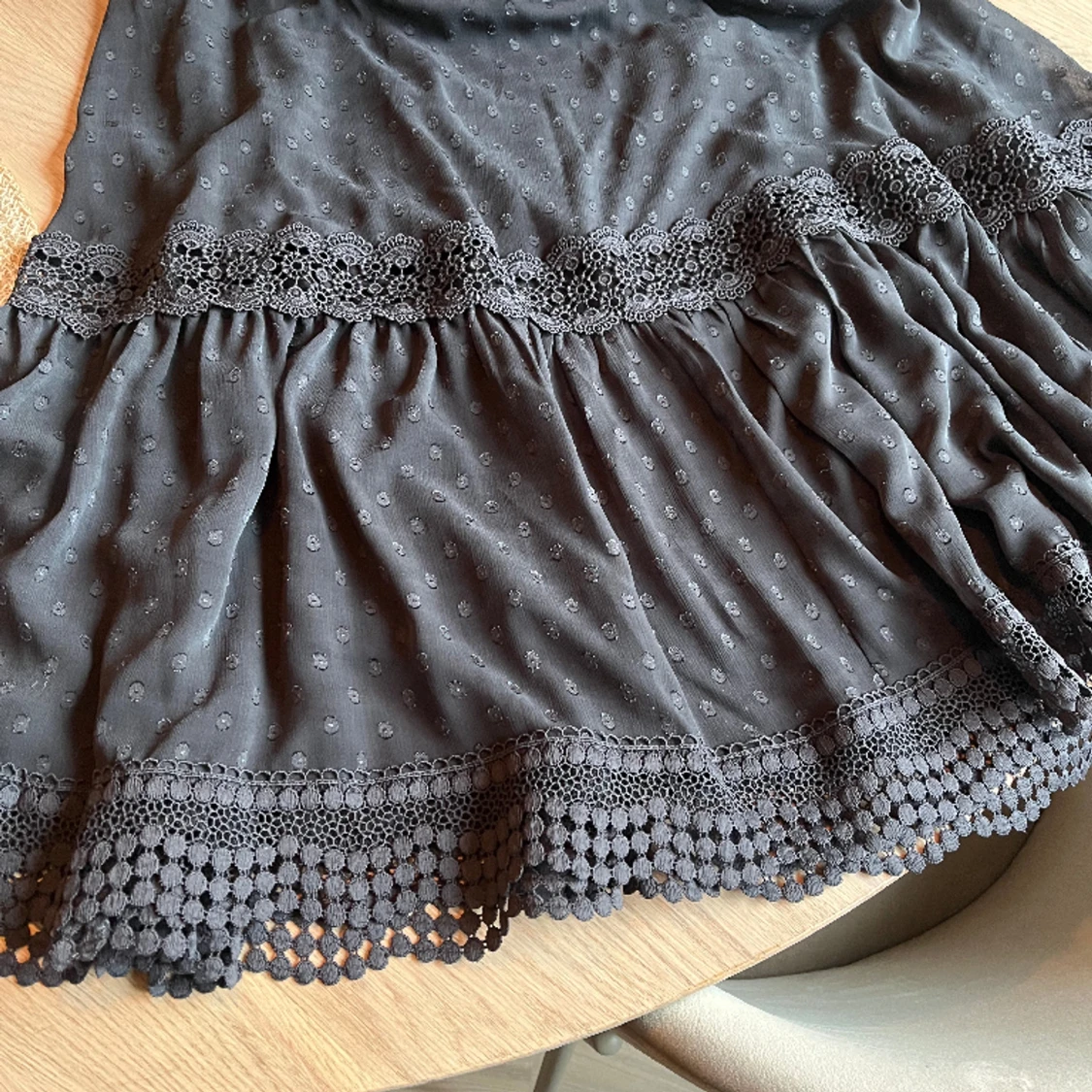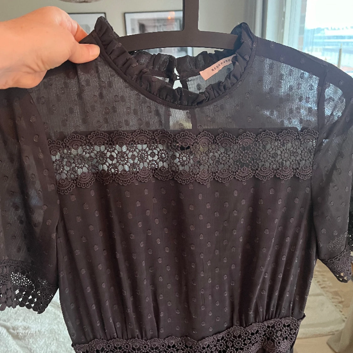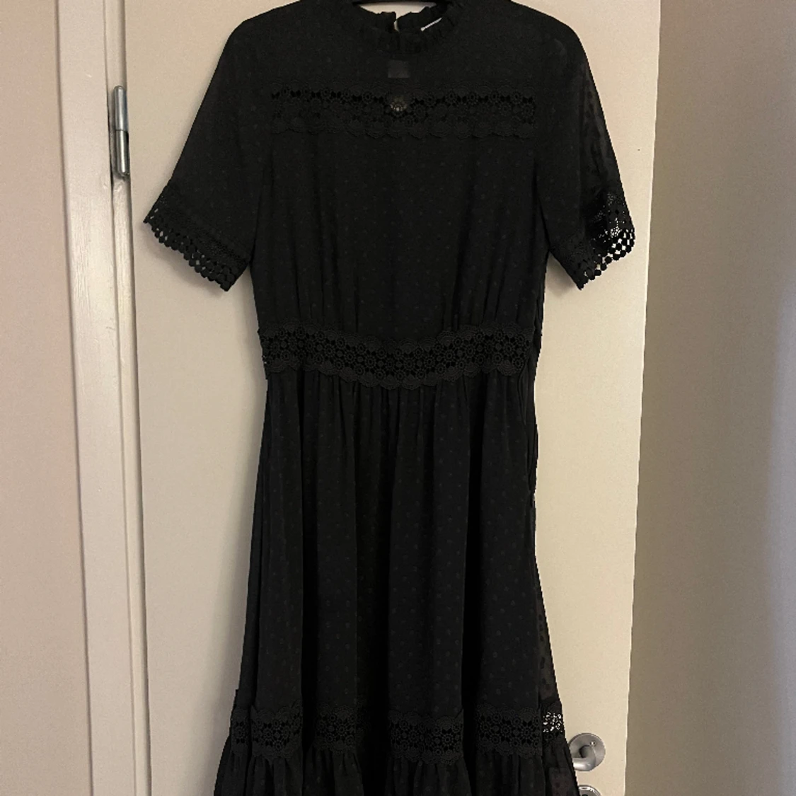 Fin klänning med fina detaljer. Färg svart grå. Korta ärmar, lång inte hela vägen ner till golvet dock. Jag är 163 cm. Köpt utomlands.