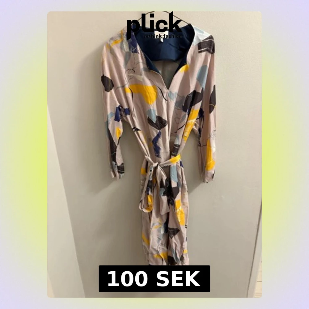 Säljer en långklänning från Nümph med abstrakt mönster i beige, gul, blå och svart. Klänningen har lång ärm, v-ringning och ett matchande knytband i midjan. Perfekt för dig som gillar färg och unika prints.