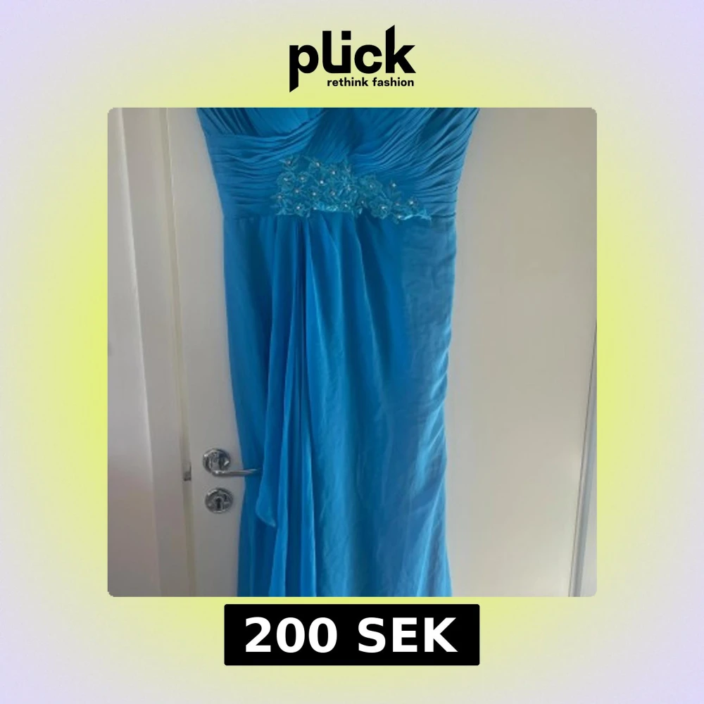 Säljer en vacker blå axelbandslös klänning med draperad överdel och dekorativa pärlor vid bysten. Perfekt för festliga tillfällen. Klänningen har en elegant fall och en lång design som ger en sofistikerad look.