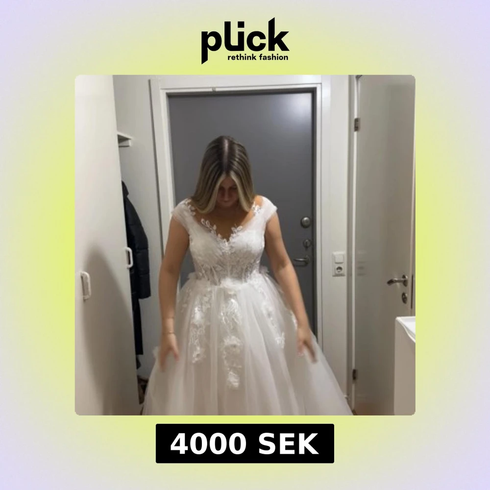 Drömmig vit bröllopsklänning med v-ringad överdel, spetsdetaljer och blommiga broderier. Kjolen är i flera lager tyll som ger en riktig prinsessig känsla. Materialet är av bra kvalitet. Aldrig använd. Pris går att diskutera. Slöja finns att köpa till.