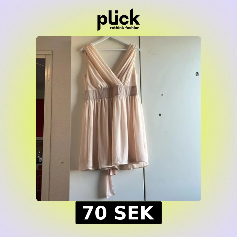Superfin kort klänning från Xoul Edition i champagnefärgad satinliknande polyester. Djup v-ringning både fram och bak, bred midja med knytband och lätt utställd kjol. Ärmlös och perfekt för sommarens tillfällen. Snyggt fall och elegant look.