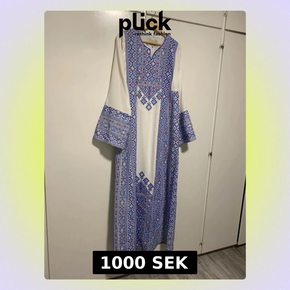 Unik vit långklänning med blått och rött broderat mönster. Klänningen har vida långärmar och en rak passform. Dekorativa detaljer längs ärmar, bröst och nederkant ger en traditionell och elegant look. Perfekt för dig som gillar statement-plagg. Det är en palestinsk klänning som har kommit till användning 1 kväll i 2 timmar.
