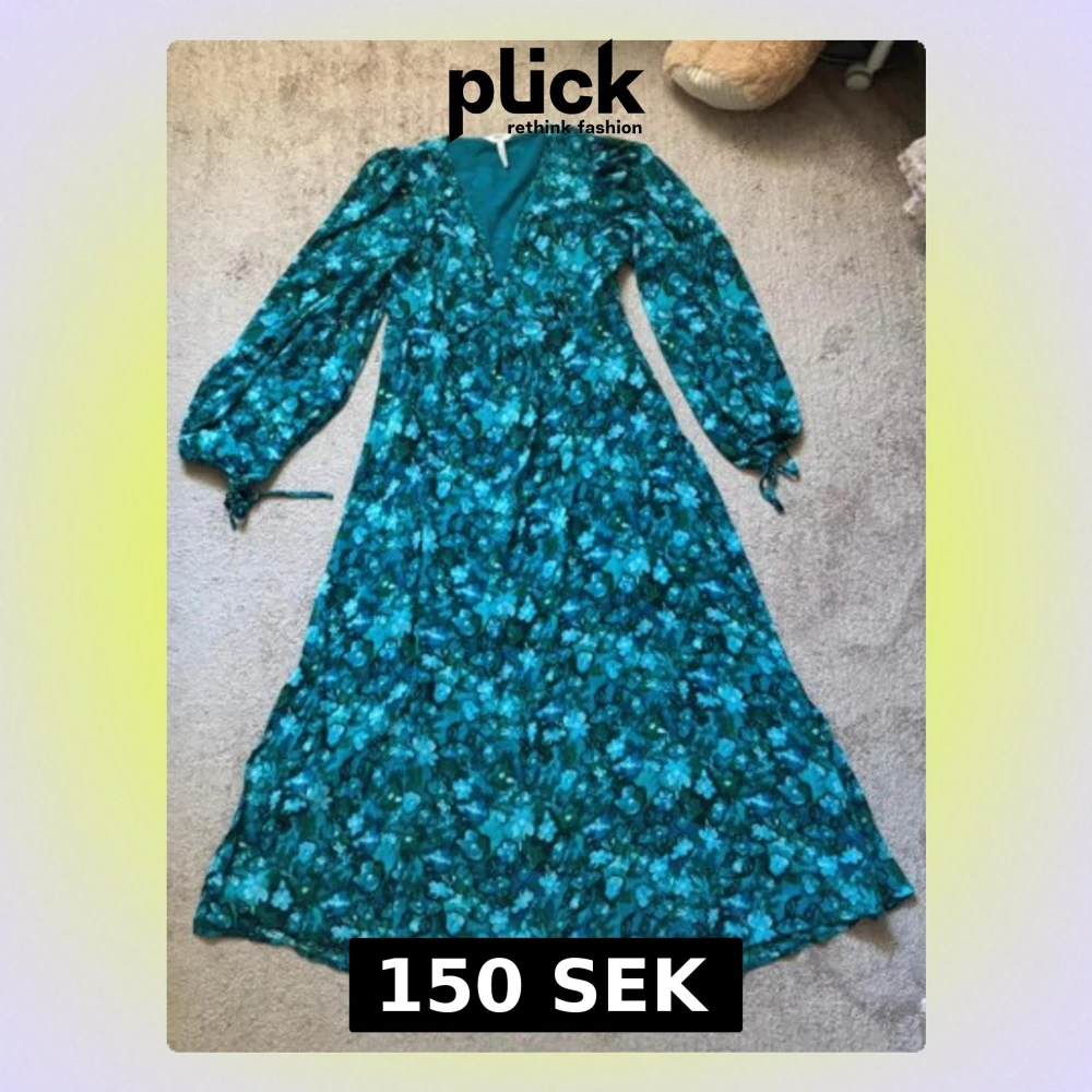 Snygg långklänning från Object i blått och grönt med blommigt mönster. Klänningen har långa puffärmar med knytband vid ärmsluten och en djup V-ringning. Tillverkad i ett lätt och luftigt material som ger ett fint fall.