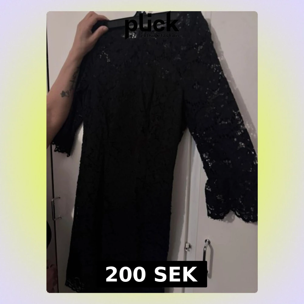 Snygg svart klänning i spets med trekvartsärmar och rund halsringning. Klänningen har en elegant, figurnära passform och är helfodrad med transparenta spetsdetaljer på ärmarna. Perfekt för dig som gillar stilrena och klassiska plagg.