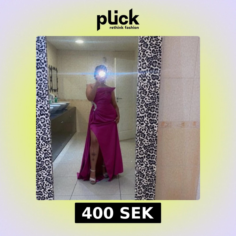 Snygg rosa långklänning med en axelbandslös design och en elegant slits. Klänningen har en glittrig detalj vid midjan som ger extra glamour. Perfekt för en festlig kväll!