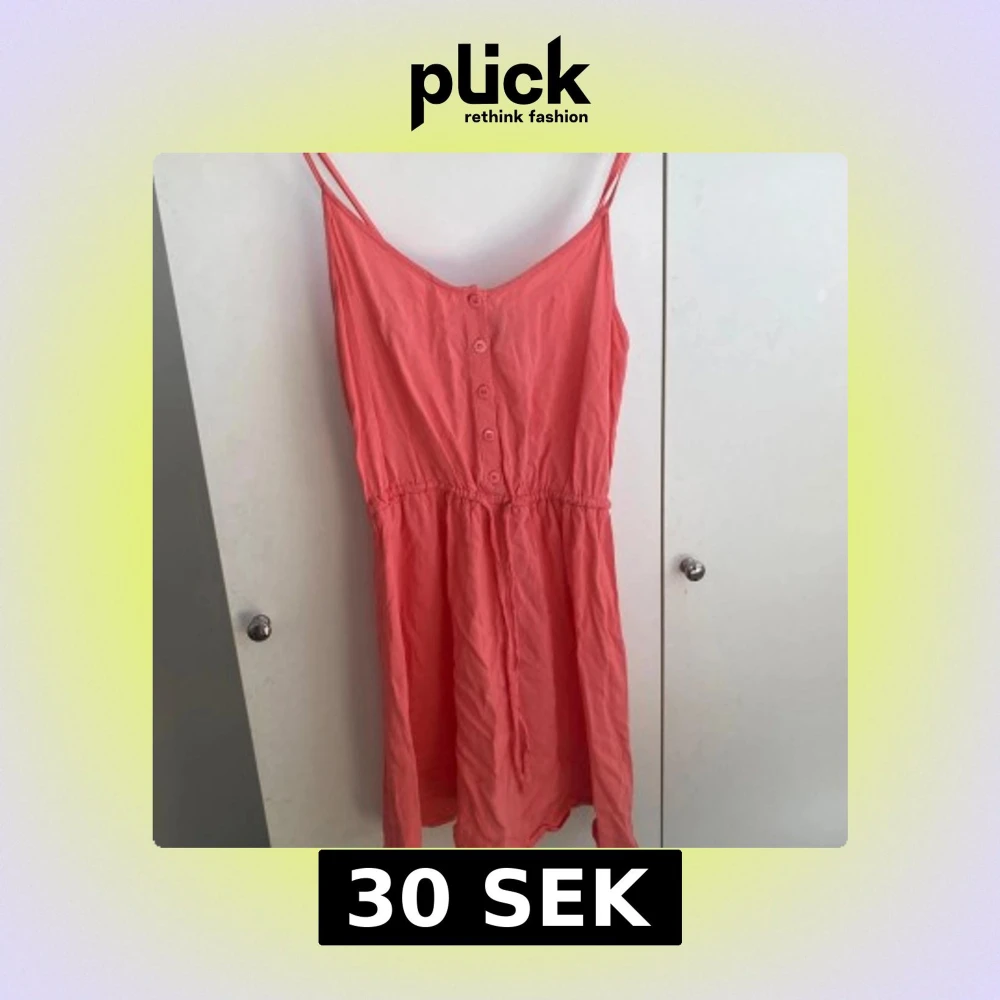 Säljer en söt korallrosa klänning med smala axelband och knappar framtill. Klänningen har en markerad midja och är tillverkad i ett lätt bomullsmaterial, perfekt för varma dagar.