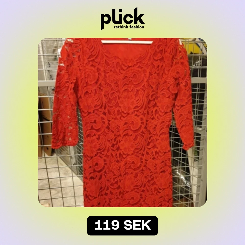 Röd spetsklänning som är knälång med 3 kvartsärm i nyskick. Strl 38. Katt finns I hemmet