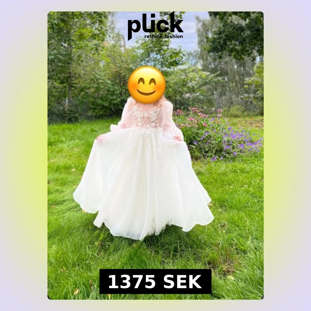 Drömmig vit långklänning med transparenta långärmar och vacker spets upptill. Kjolen är luftig och svepande med volangdetaljer. Överdelen har blommiga broderier och en lätt v-ringning, samt öppen rygg med dragkedja. Perfekt för speciella tillfällen.