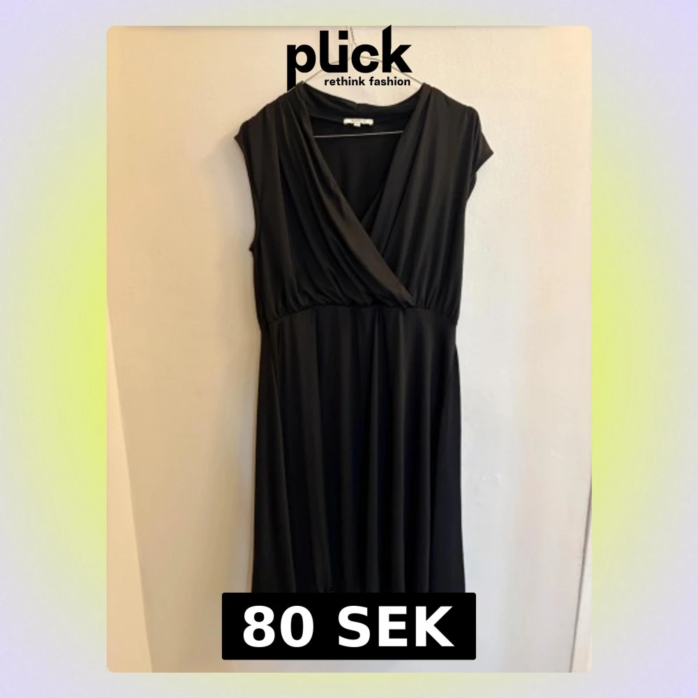 Säljer en svart omlottklänning från Rosebud i mjukt och följsamt material. Klänningen har v-ringad omlottdesign, markerad midja och är ärmlös. Perfekt för dig som gillar enkel men stilren look.