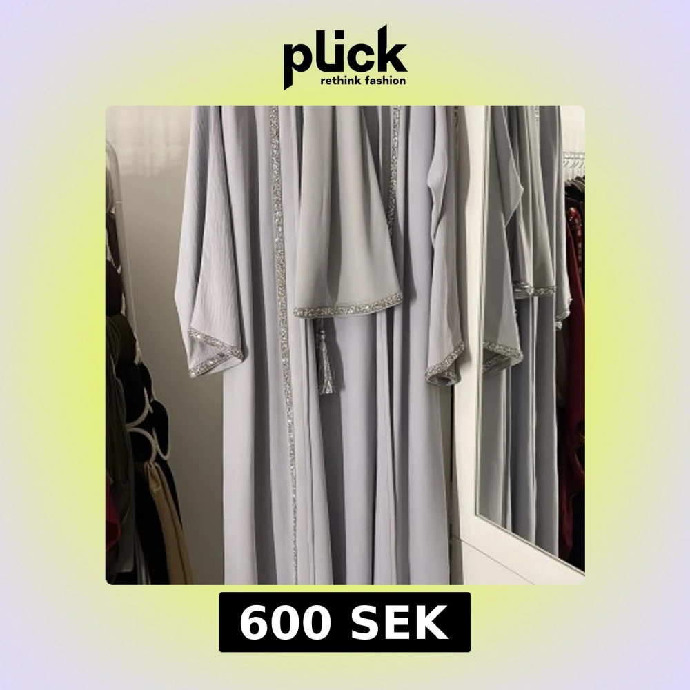 Elegant ljusgrå abaya med glittriga kanter och ett knytband i midjan. Klänningen har långa ärmar och en avslappnad passform. Passande sjal och underklänning följer med. Användes endast en gång! (Kan fraktas)