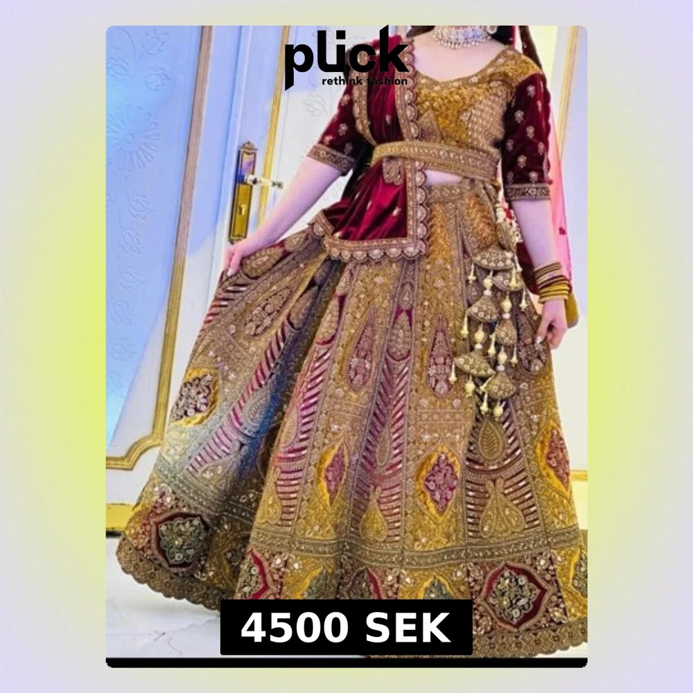 Unik långklänning i vinrött och guld med detaljerat broderi och paljetter. Klänningen har halvlånga ärmar, v-ringning och dekorativa hängen i midjan. Lyxig känsla med inslag av traditionell design och vackra mönster. Köpt i Indien ingår 2 duppata /sjal i olika tyg passar xs ,S och M