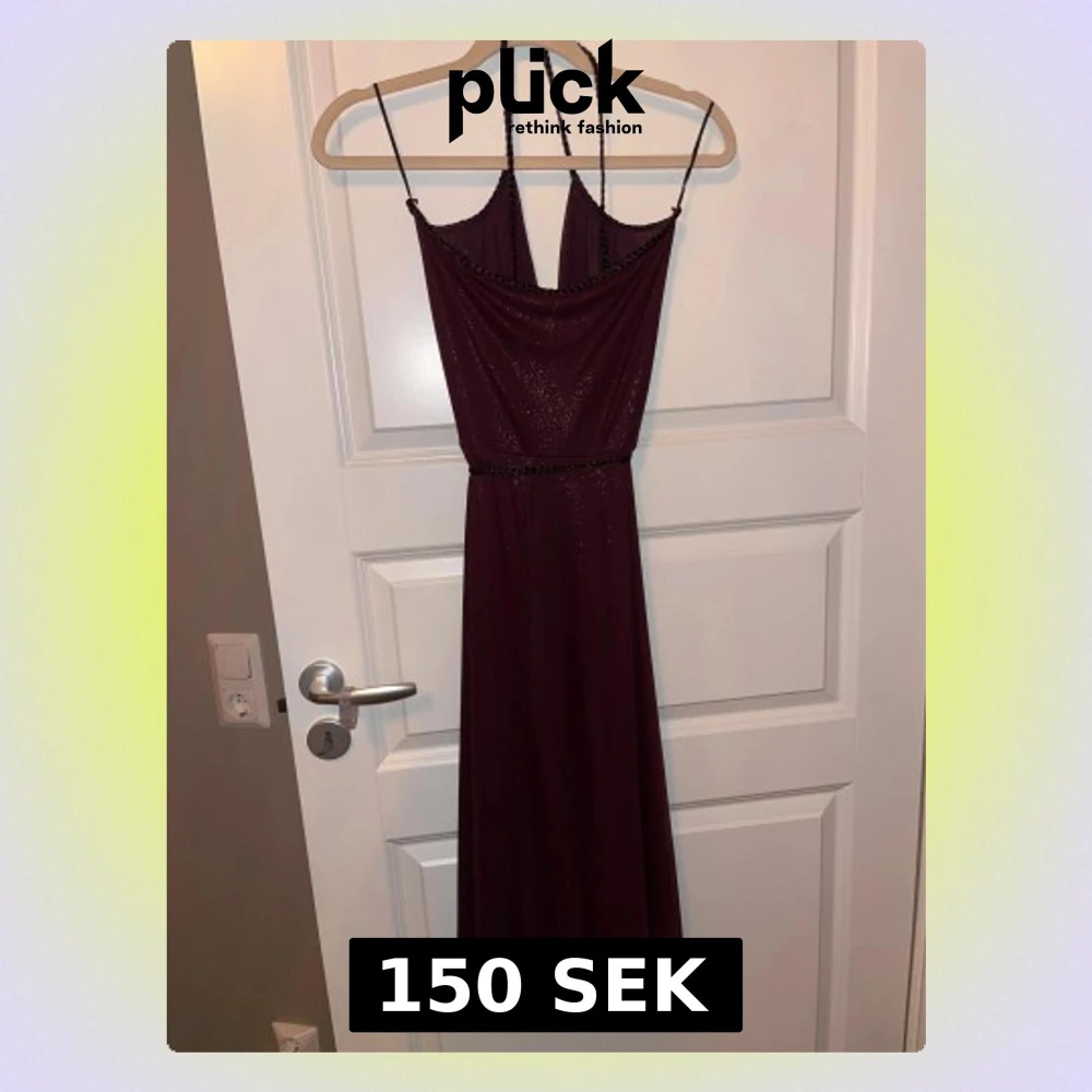 Vinröd långklänning med glittrigt tyg och smala axelband. Klänningen har omlott-drapering framtill, flätade detaljer vid axelband och midja samt ett knytbälte med pärlor. Perfekt för dig som vill sticka ut med en elegant och trendig look.