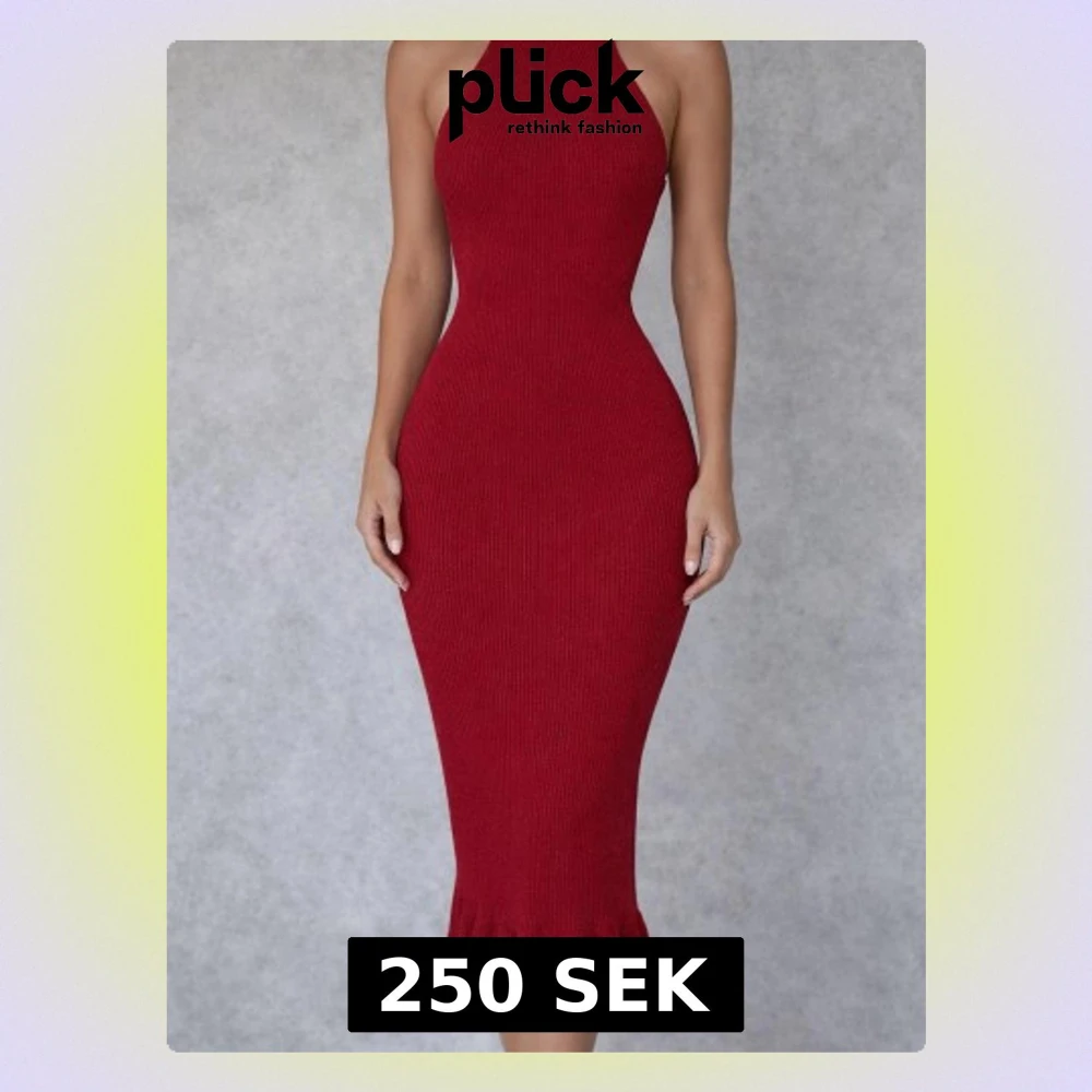 Snygg röd ribbad midiklänning med halterneck och figurnära passform. Klänningen har volangkant nertill och är ärmlös, perfekt för dig som vill sticka ut. Materialet är stickat och ger en lyxig känsla.