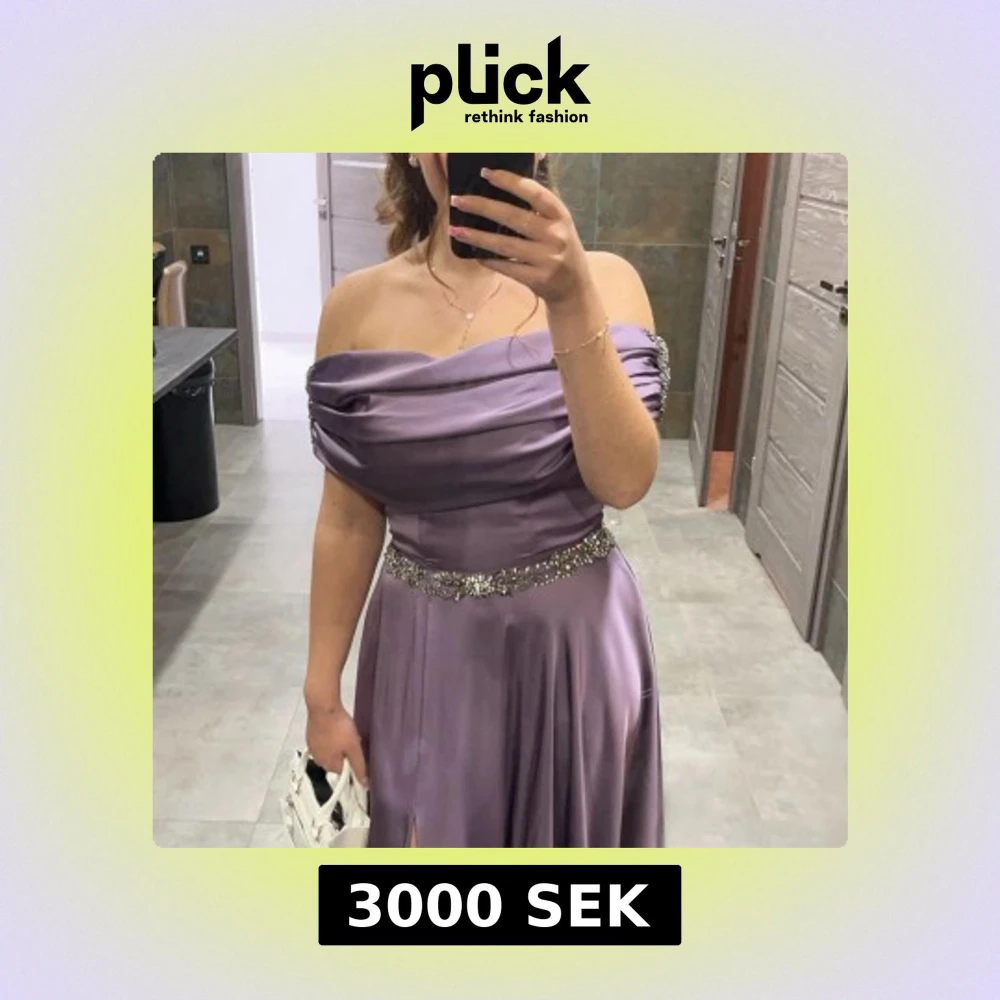 Säljer en elegant ljuslila långklänning med draperad offshoulder-ringning och glittriga dekorationer på axlar och midja. Klänningen har en vacker, flytande siluett och är perfekt för bal eller fest. Materialet känns lyxigt och skimrande. Endast använd en kväll så i nyskick