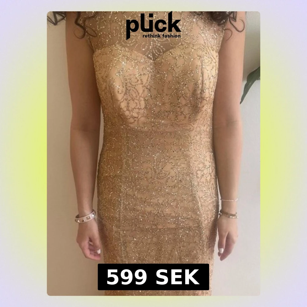 Elegant långklänning i champagnefärg med glittrigt mönster och figurnära passform. Klänningen har rund halsringning och är ärmlös, perfekt för speciella tillfällen. Dragkedja bak för enkel påklädning.