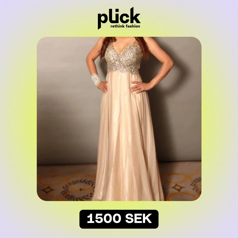 Elegant klänning i fint material, använd 2 gånger. Storlek L men ganska liten och passar som Small eller storlek 36-38. Modellen på bilden är storlek Bröstet 36, midya 26 och häfte 38. Längd 157 med höga skor eller 165 längd med en flat skor.