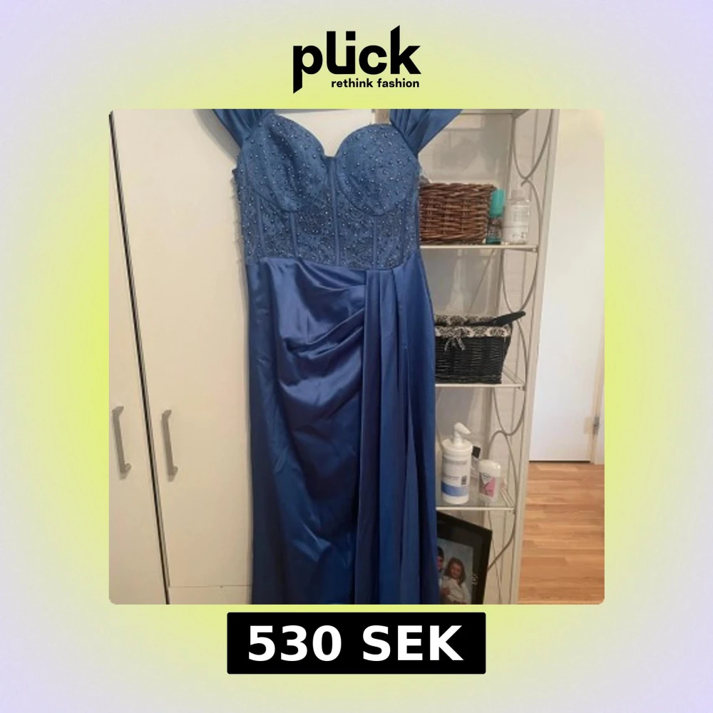 Snygg blå långklänning med axelband och hjärtformad byst. Överdelen är dekorerad med spets, pärlor och små stenar för extra bling. Kjolen är i glansigt tyg med drapering framtill. Perfekt för bal eller festkväll!
