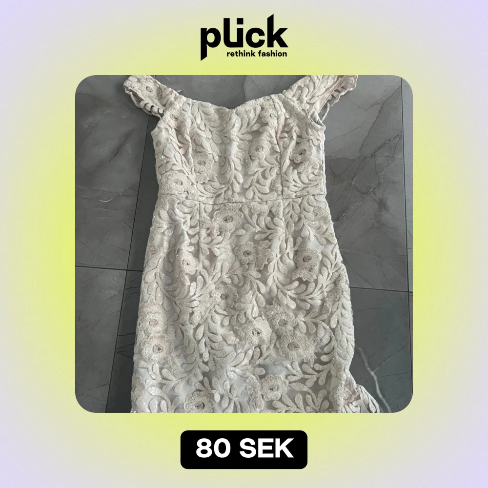 Elegant beige klänning med vackert blommigt spetsmönster. Klänningen har korta ärmar och en figurnära passform som framhäver silhuetten. Perfekt för speciella tillfällen.