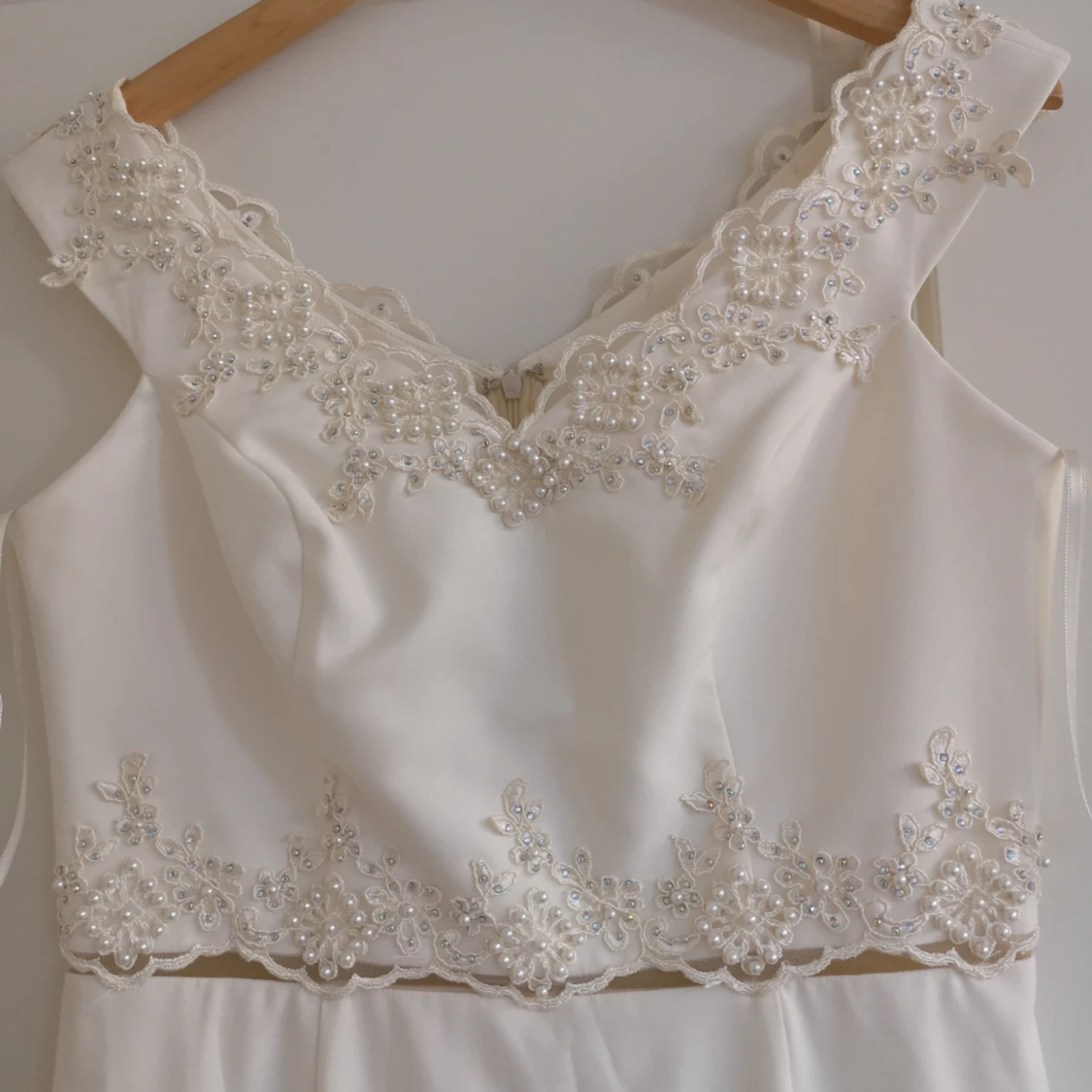 Vit kort klänning med spets och volang - Supersöt vit kort klänning med broderade spetsdetaljer, omlott-v-ringning och volangkant. Armarna har knappar så man kan stänga, se bild 3. Och en dragkedja på vänster sidan för att enklare få på sig den. Står strl 38 och den passar mig som brukar ha S/M i kläder. Lagom lång på mig som är 168cm. Undra du nått är de bara att skriva