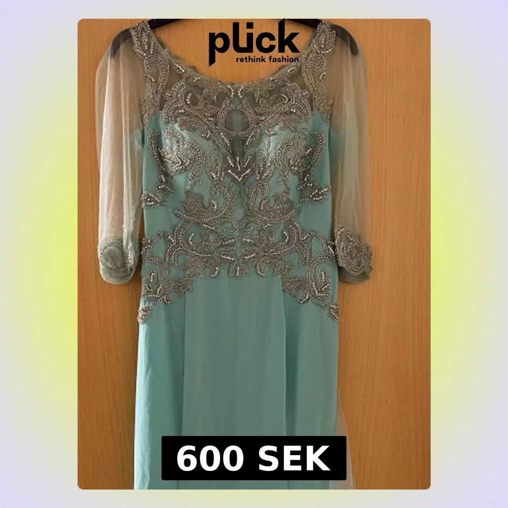 Elegant långklänning i ljusblått med detaljerat silverbroderi och pärlor över byst, midja och ärmslut. Klänningen har transparenta trekvartsärmar i tunn mesh och en mjuk, flytande kjol. Perfekt för speciella tillfällen där du vill sticka ut.
