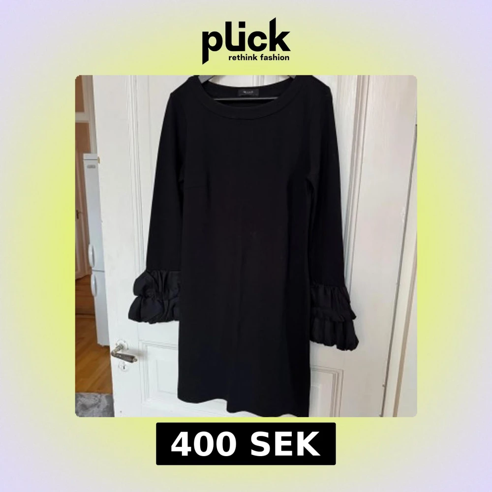 Elegant svart klänning från Sand Copenhagen med långa ärmar och volangdetaljer vid ärmsluten. Perfekt för en stilren look. Klänningen har en klassisk och tidlös design. Storlek 40. Mycket fint skick!
