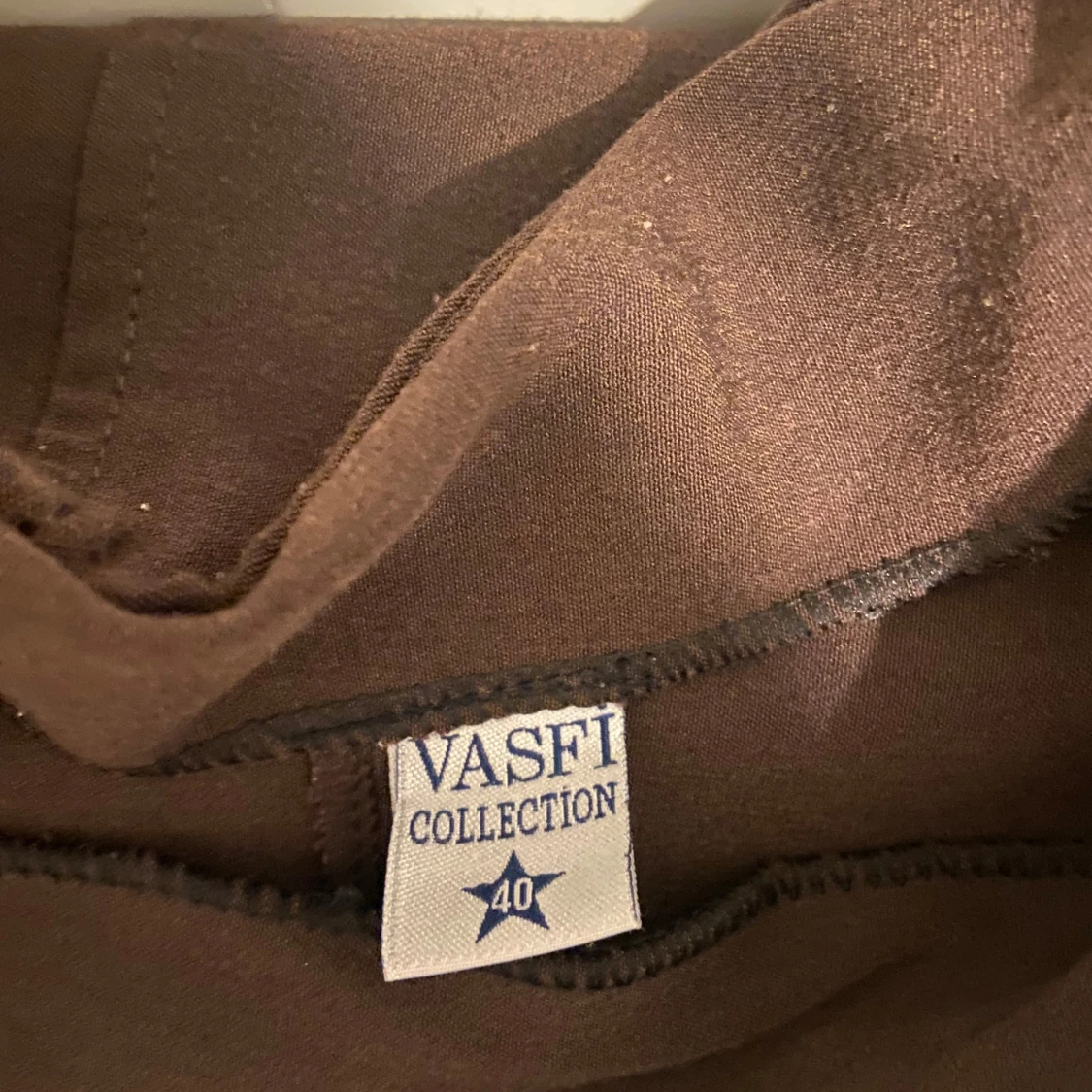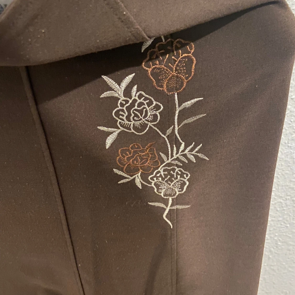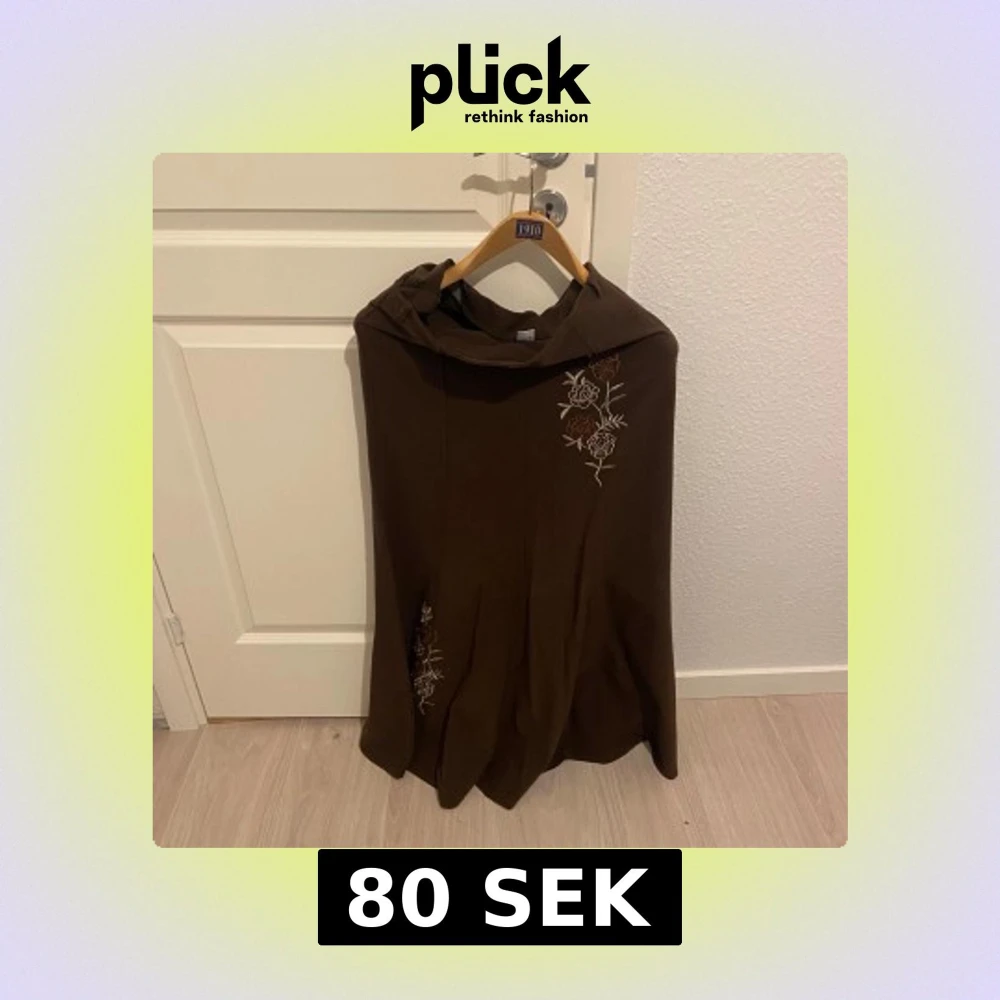 Säljer en elegant brun kjol från Vasfi Collection med vackra broderade blommor i vitt och orange. Perfekt för att lägga till en touch av stil till din outfit. Kjolen har en mjuk och bekväm passform.