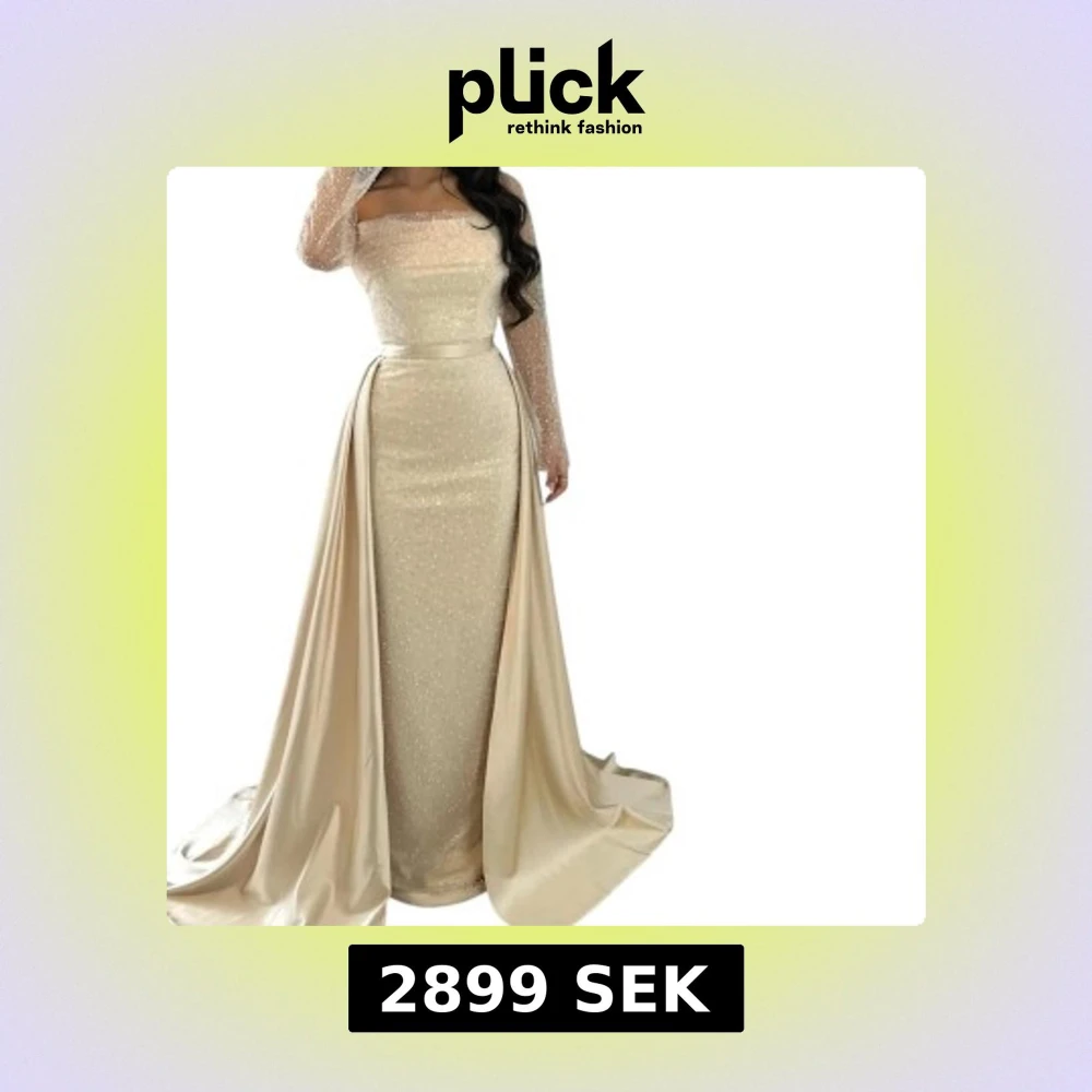 Säljer en elegant champagnefärgad långklänning med pärlprydd mesh upptill och långa ärmar. Klänningen har en figurnära siluett, markerad midja och ett svepande släp. Materialet är glansigt och ger en lyxig känsla, perfekt för bal, nyår eller förlovning. Storlek 38-40