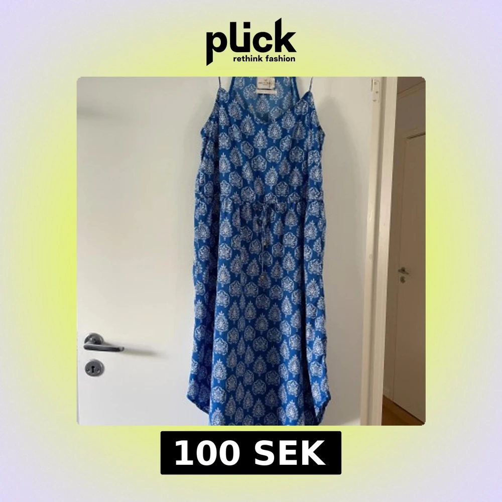 Snygg blå klänning från Holly & Whyte by Lindex med vitt mönster och smala axelband. Klänningen har knyt i midjan för en skön passform och är tillverkad i ett lätt och luftigt material, perfekt för varma dagar. Axelbandet har gått av bak på ena sidan, men bara att enkelt sy fast igen.