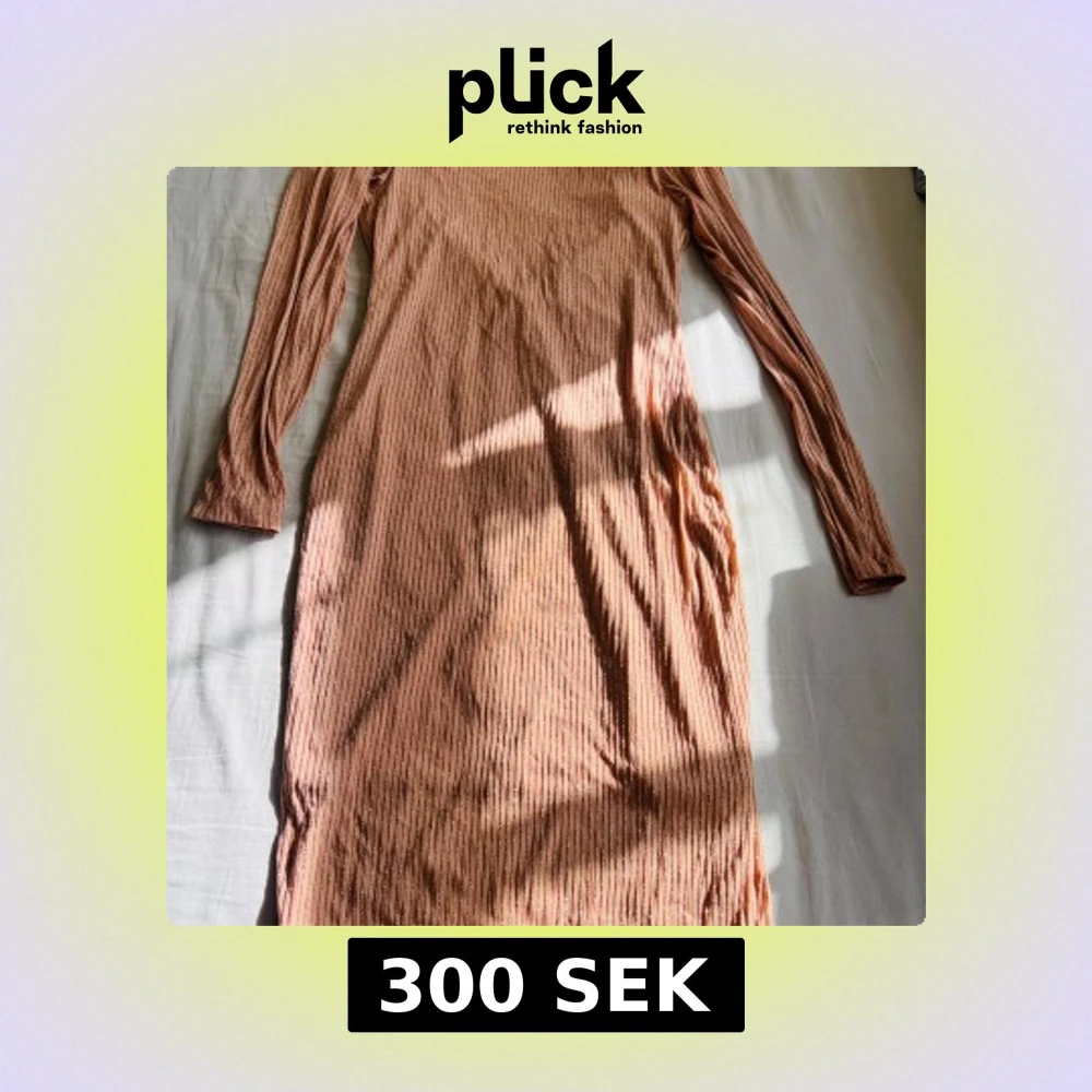 Säljer en långklänning i persikofärgad ton med glittriga ränder och v-ringning. Klänningen har lång ärm och är tillverkad i ett stretchigt, glittrigt material som ger en snygg effekt. Perfekt för dig som vill sticka ut med stil.