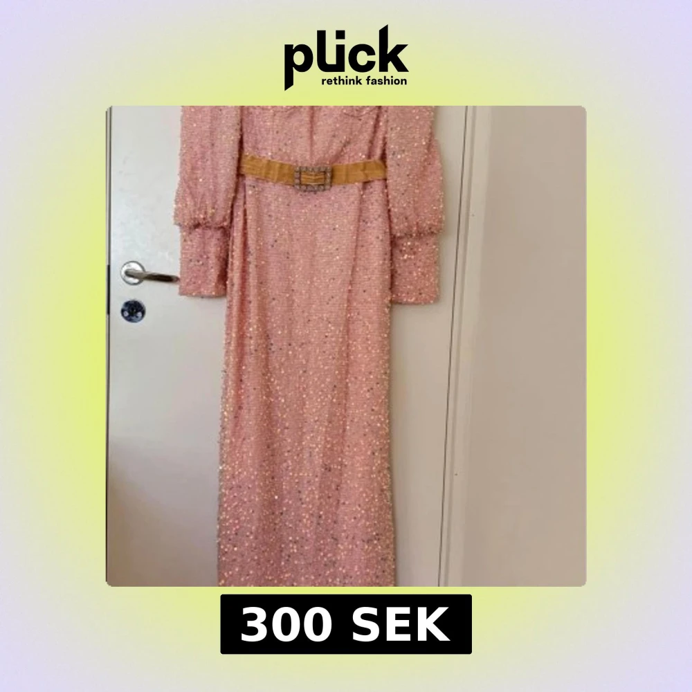 Elegant ljusrosa långklänning med glittriga paljetter, markerad midja med dekorativt bälte och långa puffärmar. Klänningen har fyrkantig ringning och figurnära passform som framhäver siluetten. Perfekt för bal eller fest.