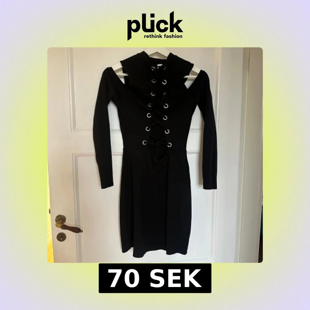 Svart kort klänning från Divided H&M med långa ärmar och coola cut out-detaljer vid axlarna. Framsidan har snörning med metallöljetter som ger en edgy vibe. Mjuk stretchig polyesterblandning och figurnära passform. Perfekt för dig som gillar statement-plagg.
