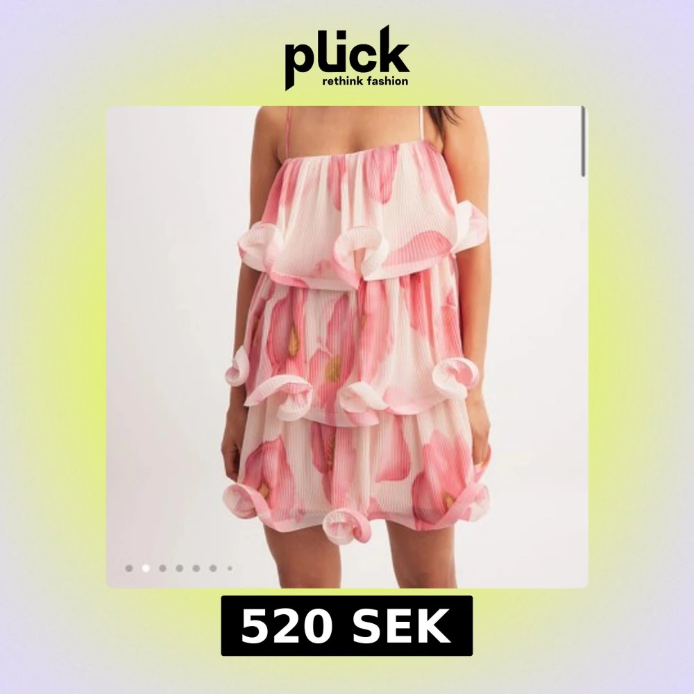 Superfin kortklänning med stora rosa blommor och volangdetaljer. Klänningen har tunna axelband, är ärmlös och har ett luftigt, plisserat tyg som ger en riktigt somrig vibe. Klänningen är helt ny med prislapp kvar. Nypris var 699kr