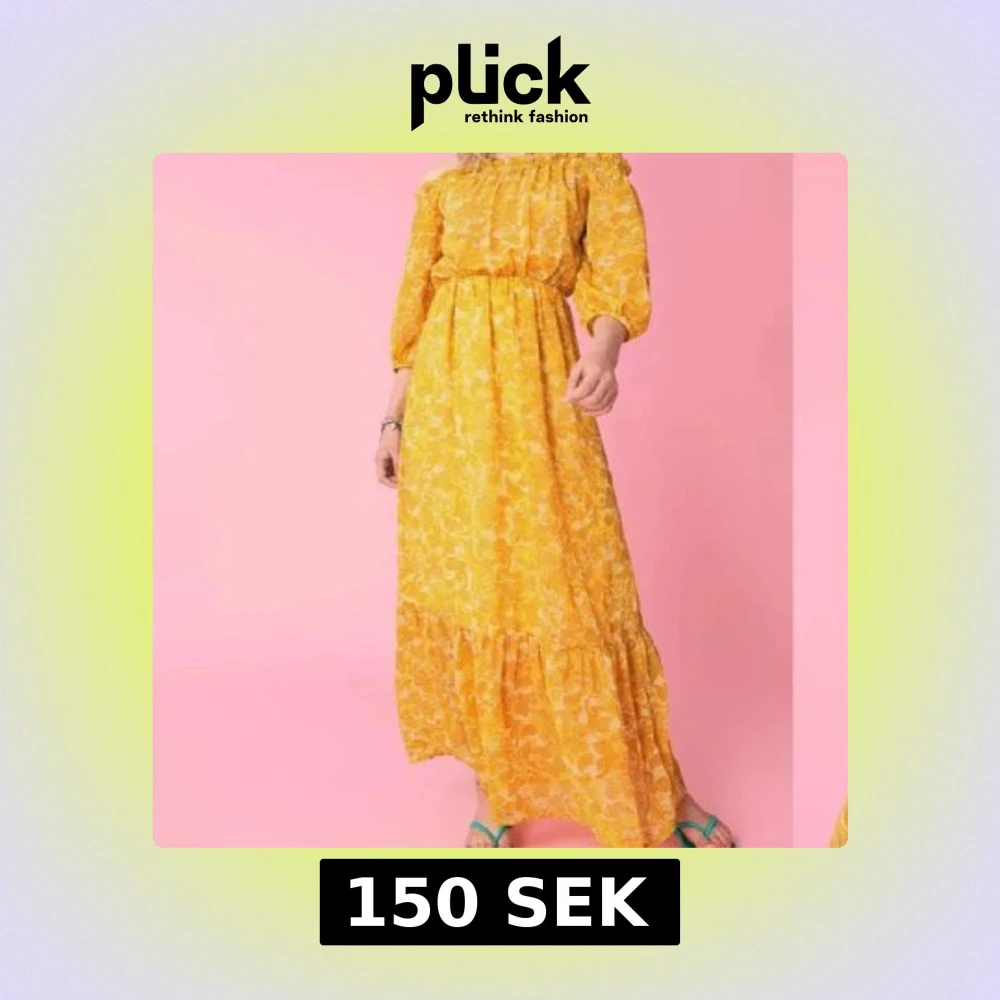 Charmig gul långklänning med blommigt mönster och offshoulder-design. Klänningen har trekvartsärmar och volangdetaljer vid fållen. Perfekt för sommarens festligheter!