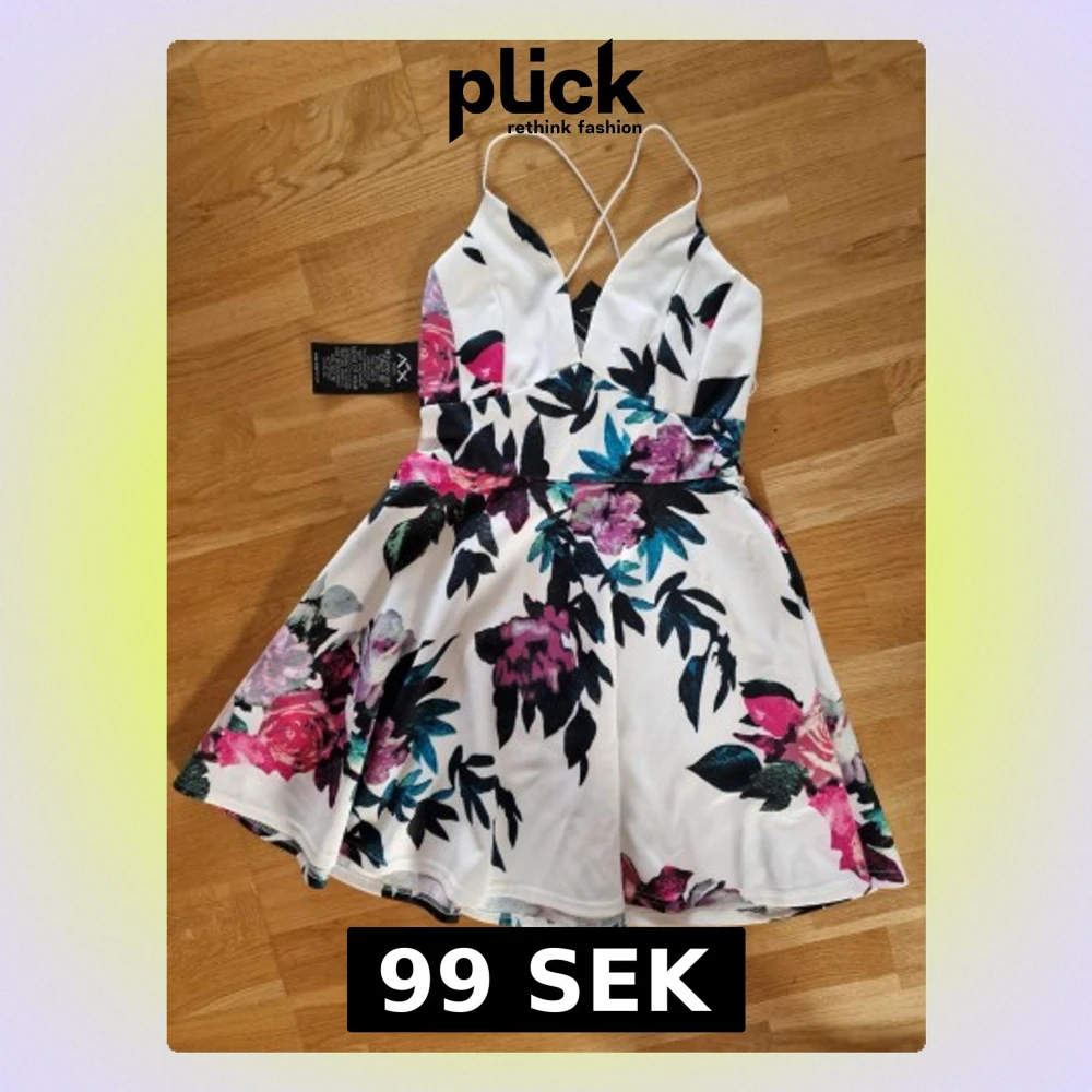 Supersöt vit kortklänning från AX Paris med färgglatt blommönster i rosa, lila och blå toner. Klänningen har smala axelband som korsas i ryggen, djup v-ringning och en utställd kjol. Perfekt för sommarens alla tillfällen!