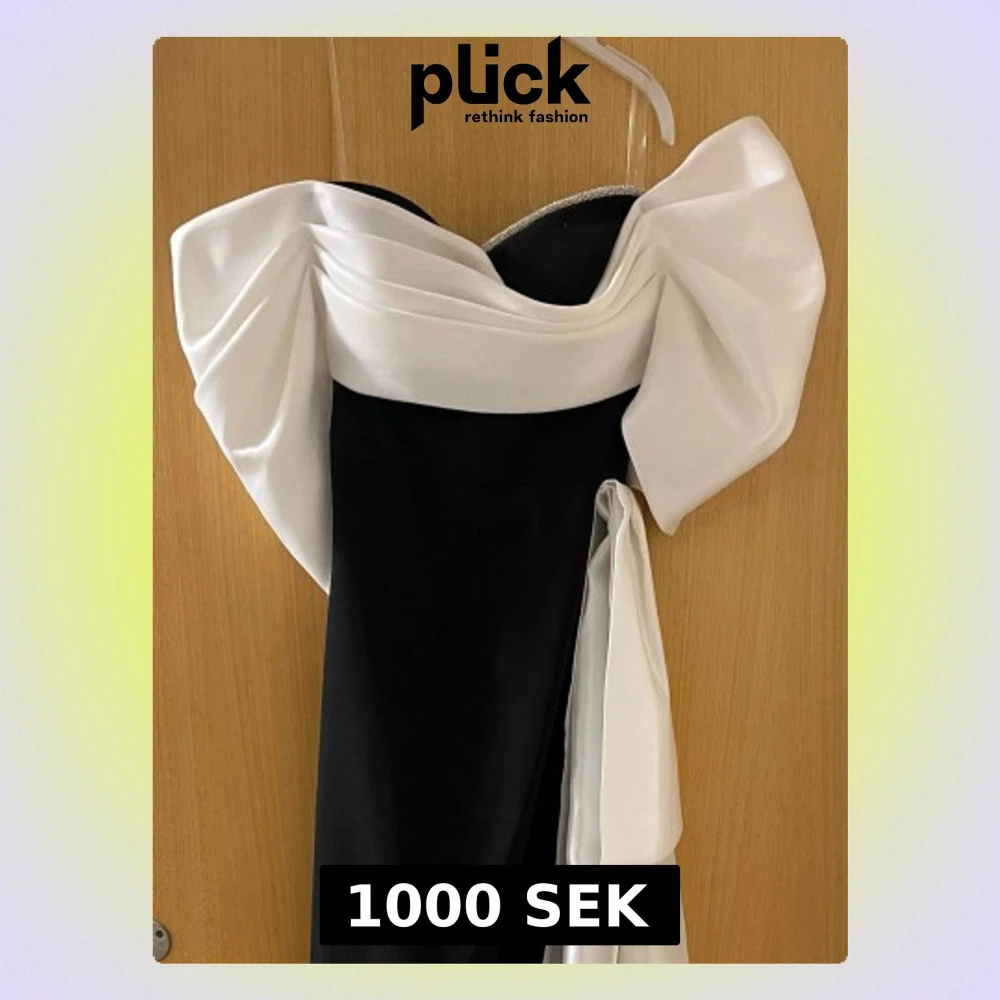 Snygg svart och vit axelbandslös klänning med stor rosett baktill och draperad överdel. Klänningen har en elegant, lång siluett och är dekorerad med en glittrig kant upptill. Perfekt för dig som vill sticka ut på festen.