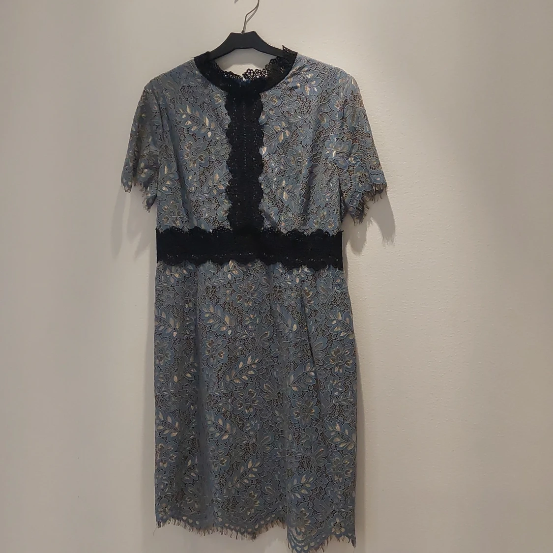 Säljer en elegant blå spetsklänning från Anna Field. Klänningen har korta ärmar och ett vackert blommigt mönster. Den har en svart spetsdetalj längs med midjan och halsen, vilket ger en fin kontrast. Perfekt för festliga tillfällen!