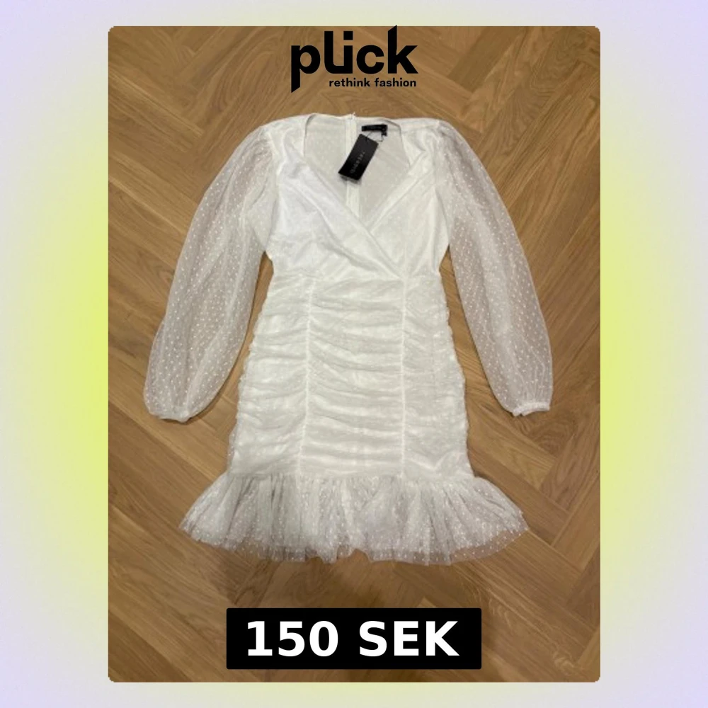 Supersöt vit kort klänning från Trendyol med transparenta långärmar och små prickar i tyget. Klänningen har omlott-v-ringning, rynkade detaljer längs kroppen och en volangkant nedtill. Materialet är lätt och meshigt, perfekt för att sticka ut med en romantisk vibe.