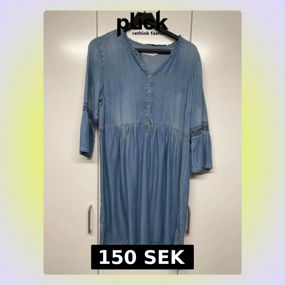 Ljusblå jeansklänning med v-ringning och knappar framtill. Klänningen har trekvartsärm med spetsdetaljer och avslappnad passform. Perfekt för dig som gillar en enkel men snygg stil. Tillverkad i mjukt jeansmaterial.