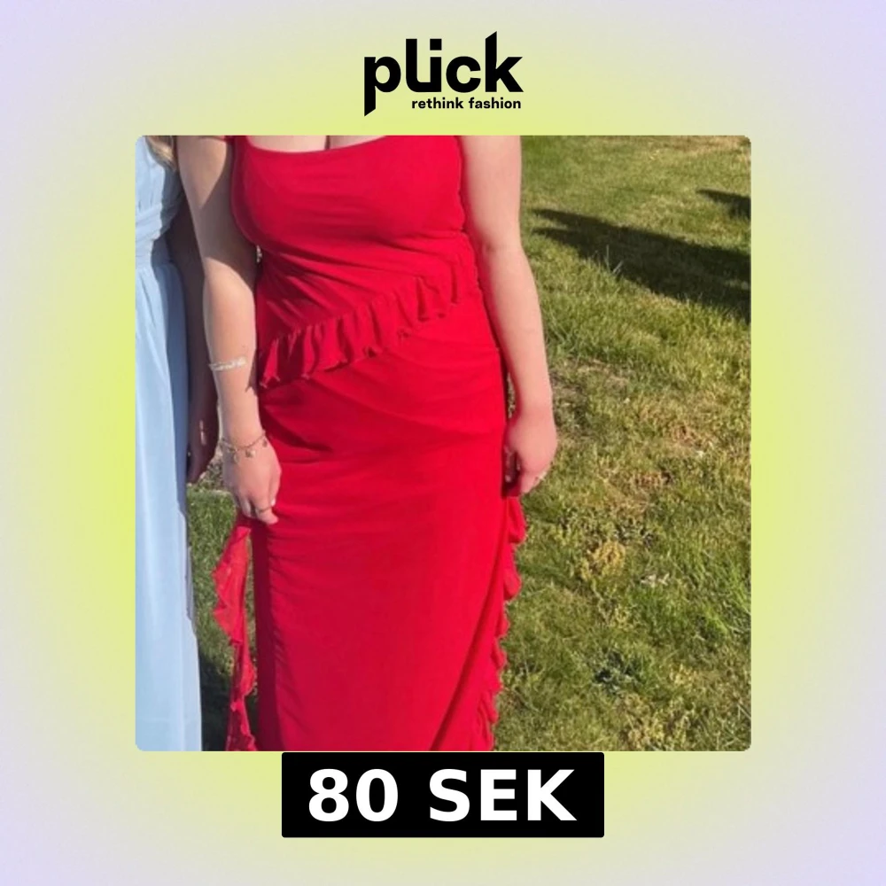 Snygg röd långklänning med volangdetaljer längs sidan. Klänningen har använts en gång på balen och är perfekt för ett liknande tillfälle. Annars bara till en sommarkväll på picknick.