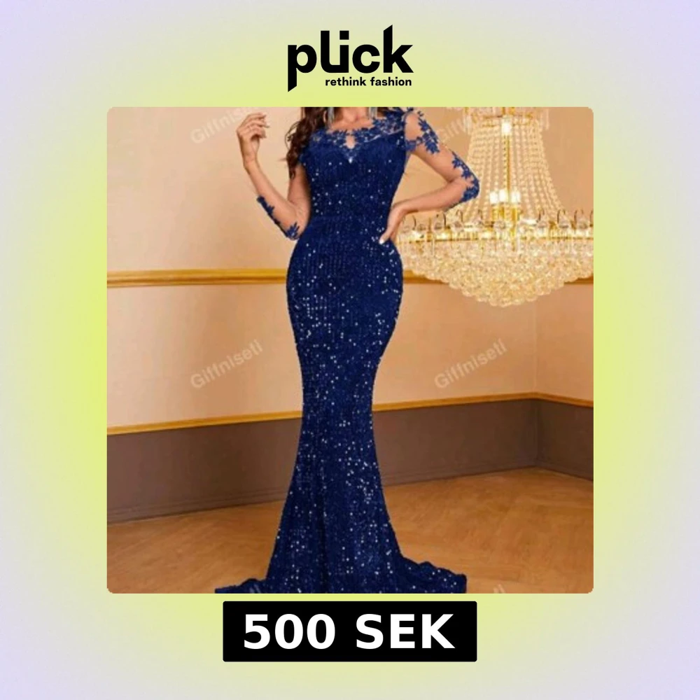 Elegant marinblå långklänning med glittrande paljetter och spetsdetaljer. Klänningen har en vacker öppen rygg och långa ärmar med blommig spets. Perfekt för en glamorös kväll.