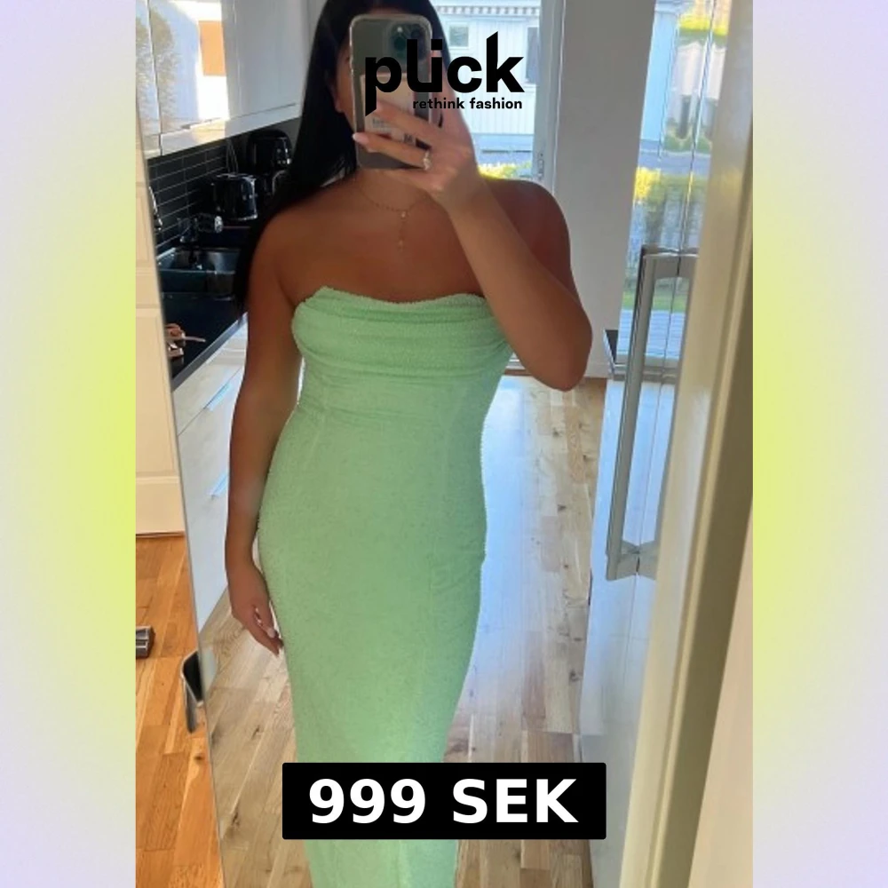 Säljer en mintgrön axelbandslös långklänning med glittriga detaljer från OhPolly. Klänningen har en figurnära passform och är täckt av små pärlliknande dekorationer som ger en lyxig känsla. Perfekt för dig som vill sticka ut med en fräsch färg och snygg siluett. Klänningen är i storlek 12 som motsvarar storlek 40, endast använd en kväll i några timmar💚