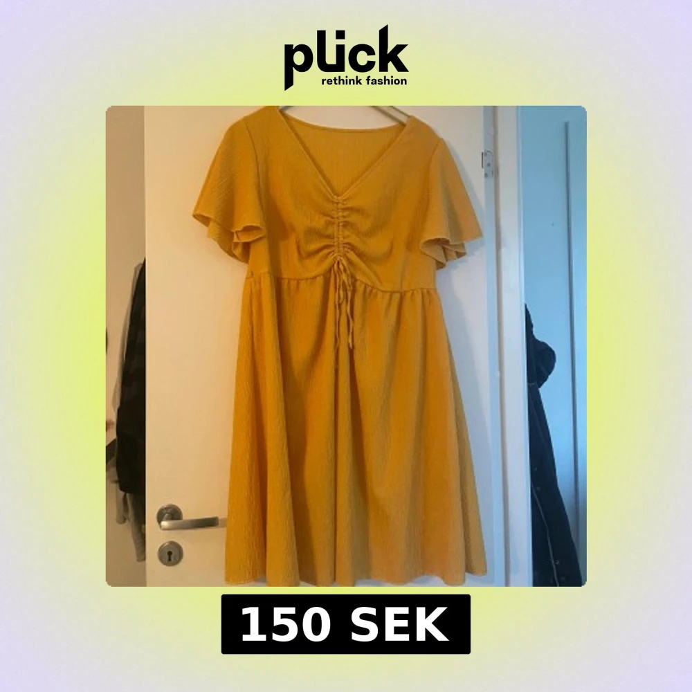 Superfin gul klänning med v-ringning och snörning framtill som ger en snygg rynkad effekt. Klänningen har korta, fladdriga ärmar och ett lätt, glittrigt tyg som känns som polyester. Passformen är loose och kjolen är utställd för en skön vibe.