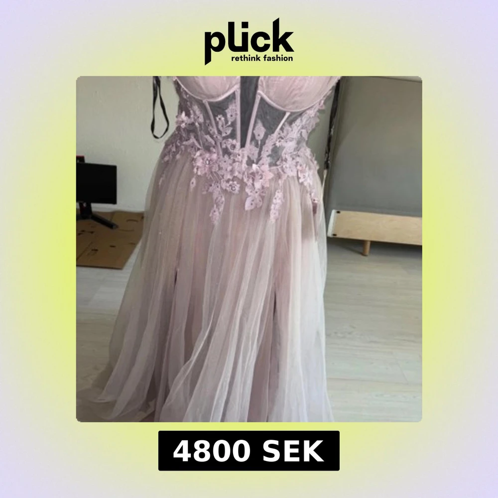 Magisk långklänning i ljuslila/rosa med transparent mesh, blommiga spetsdetaljer och glittrande tyll. Djup v-ringning och markerad midja med vackra applikationer. Kjolen är voluminös och svepande, perfekt för bal eller speciella tillfällen. (Aldrig använt, endast testat)