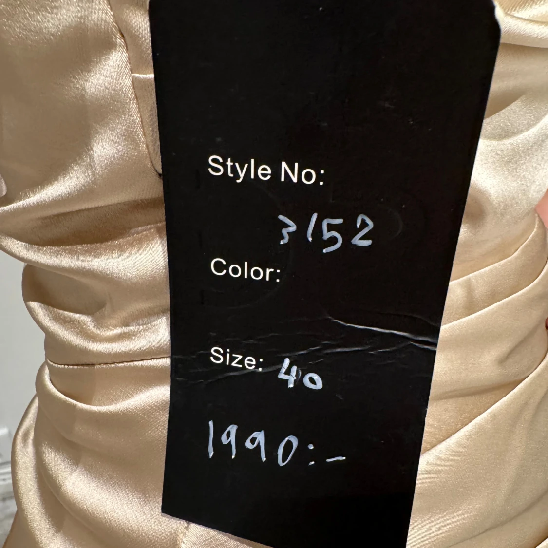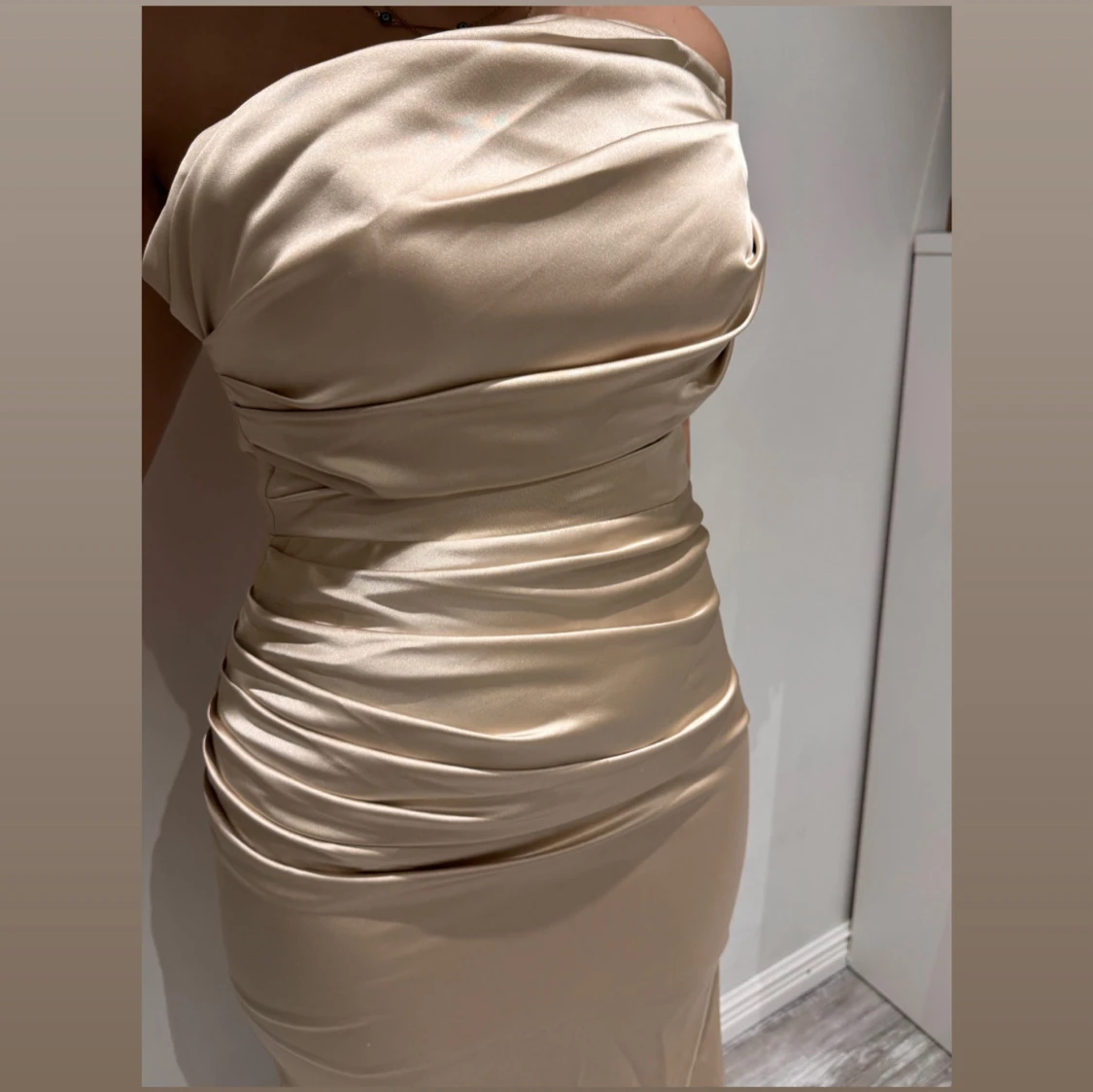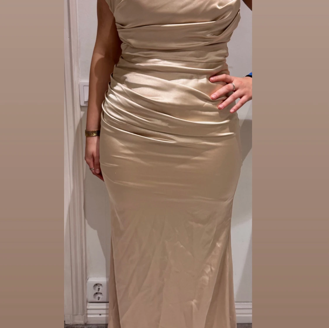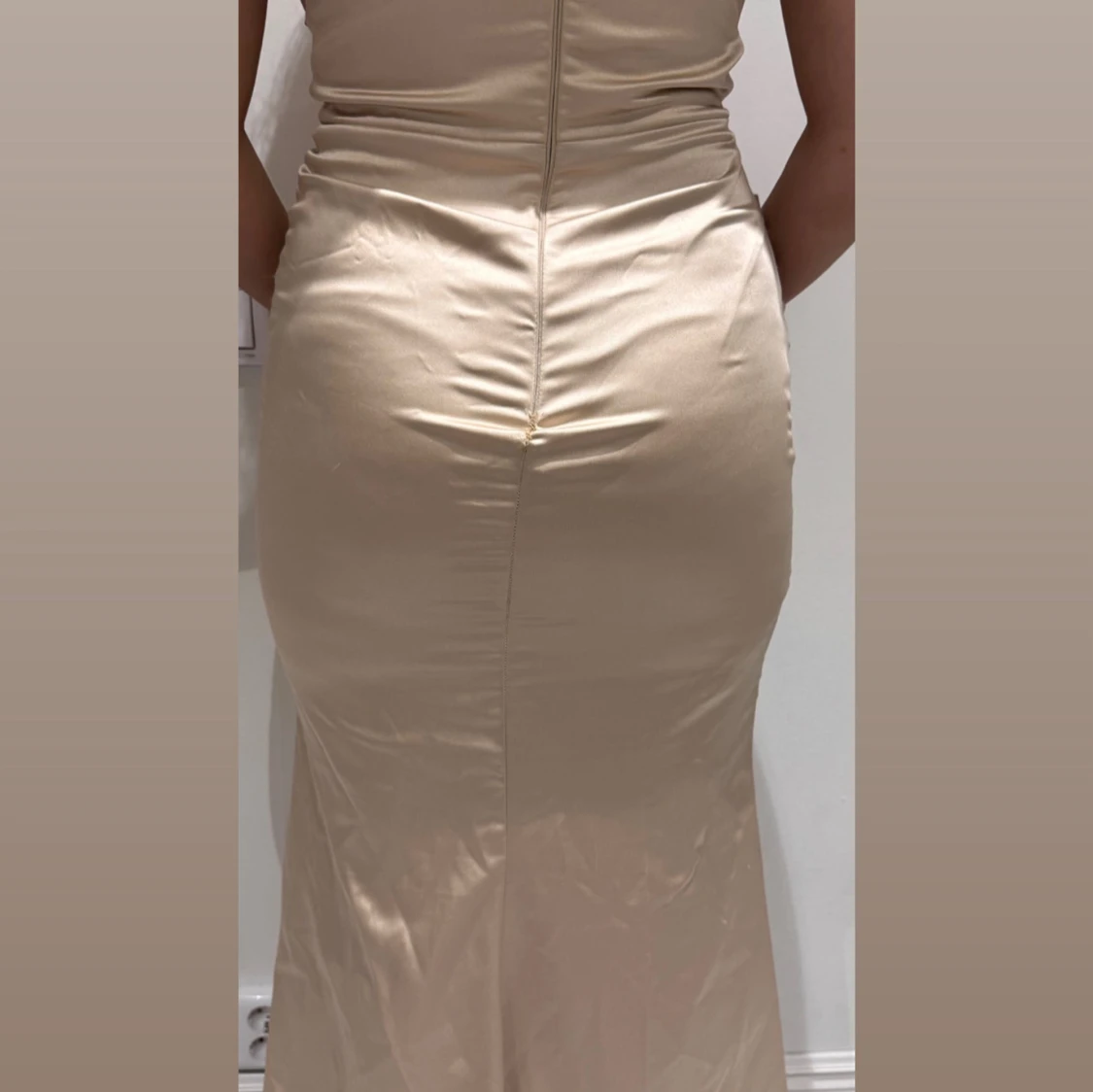 Elegant axelbandslös långklänning i champagnefärgad satin med draperad överdel och figurnära passform. Klänningen har snygga rynkade detaljer och dragkedja bak för en smickrande siluett. Storlek 40 passar även 36-38! Klänningen är från SE fashion