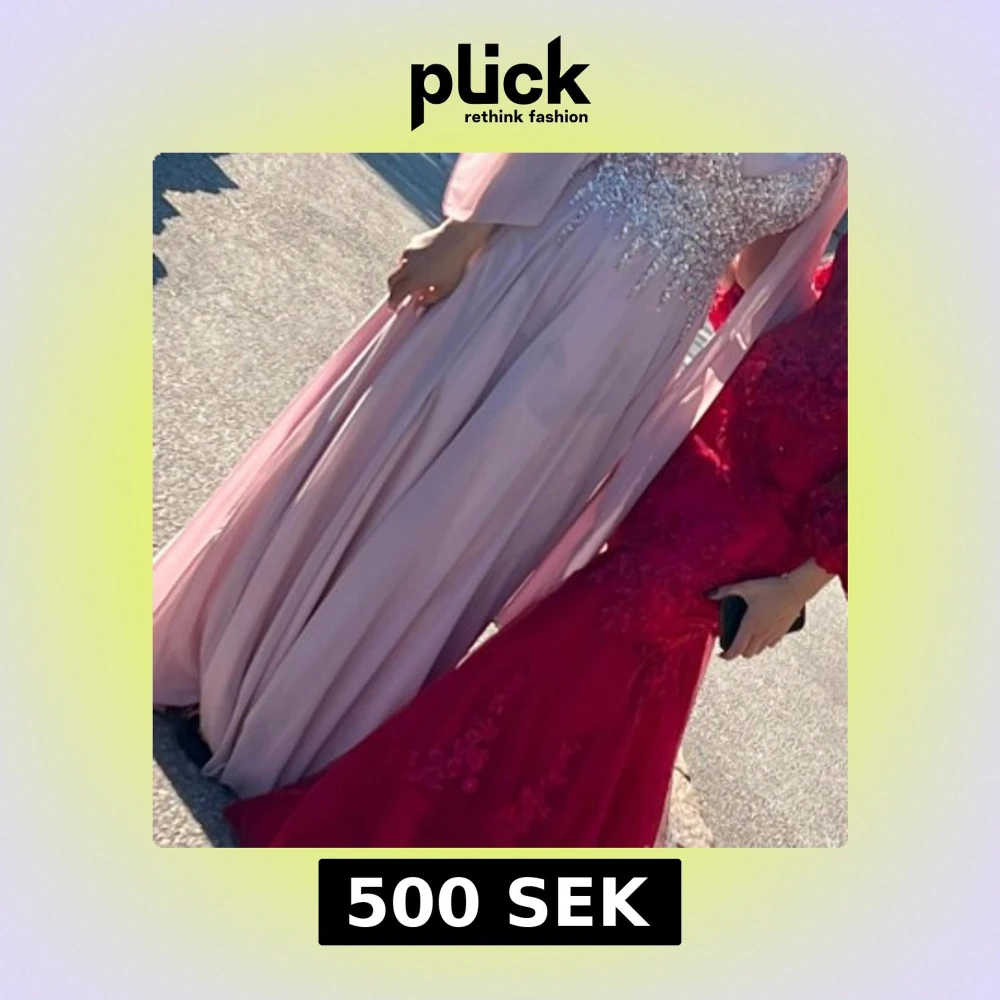 Elegant ljusrosa långklänning med glittriga paljettdetaljer upptill och svepande kjol. Klänningen har en vacker omlottkänsla och vida ärmar som ger en drömmig look. Perfekt för bal eller festliga tillfällen.