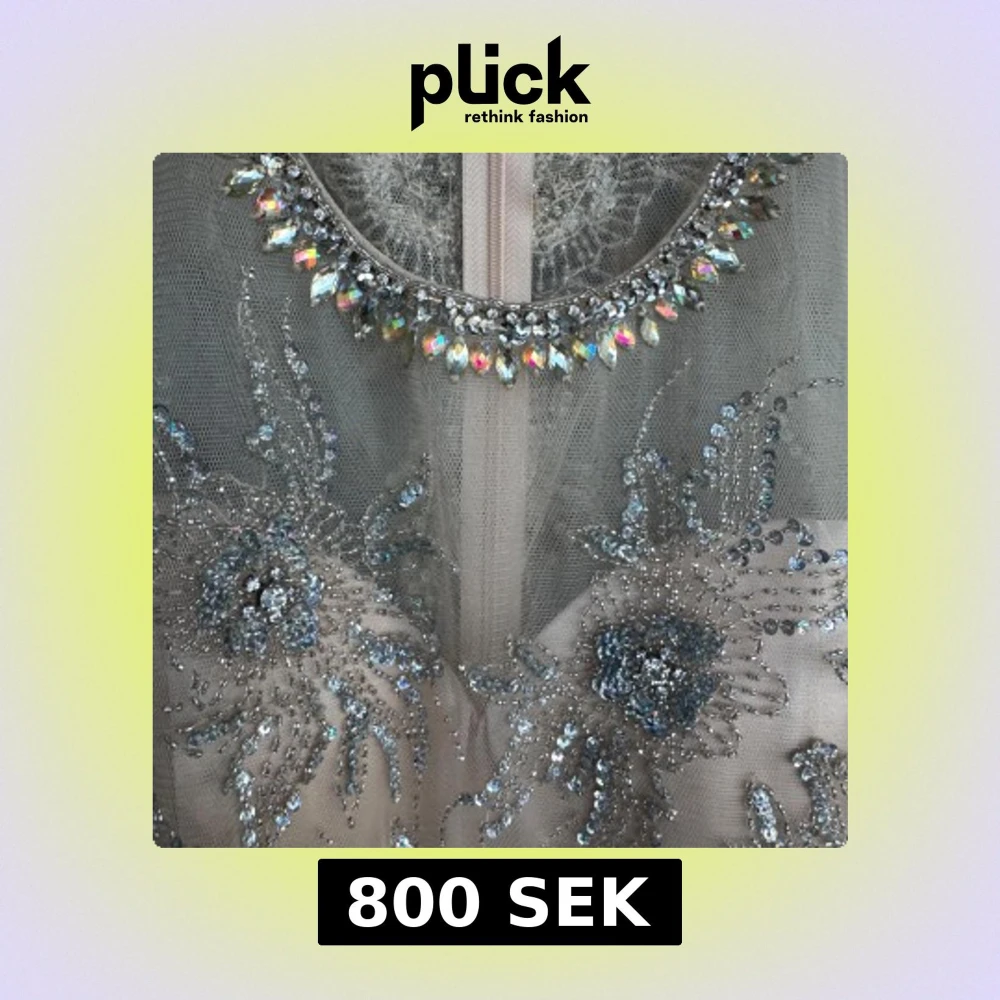 Superfin långklänning i champagnefärg med transparent mesh upptill och massor av glittrande paljetter och pärlor i blommigt mönster. Klänningen är ärmlös och har en snygg rundad halsringning med extra dekorationer. Perfekt för bal eller festligheter! Oanvänt endast provat. Köpt för 2500kr