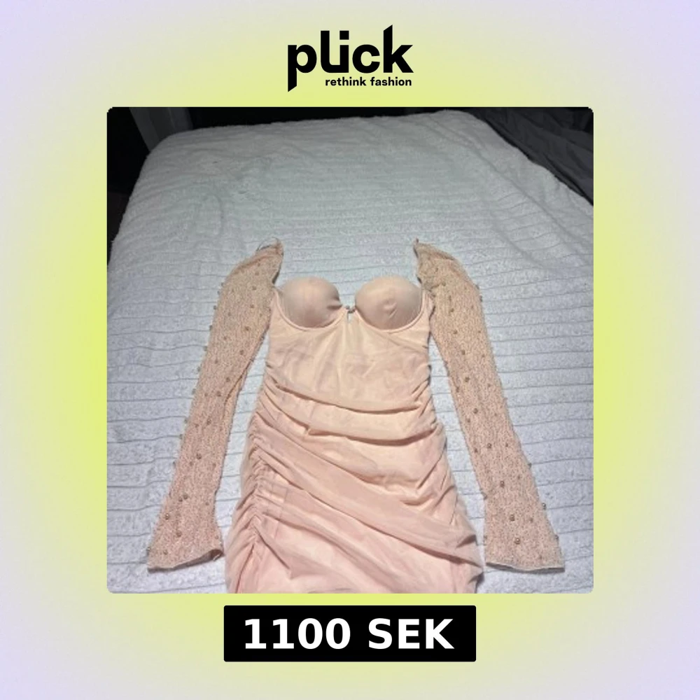 Supersnygg kort klänning i champagnefärg med vadderad byst och långa meshärmar dekorerade med pärlor och små glaspärlor. Klänningen har rynkade detaljer längs sidorna och en figurnära passform. Perfekt för dig som vill sticka ut med eleganta detaljer och unik design. Köpt från ohpolly