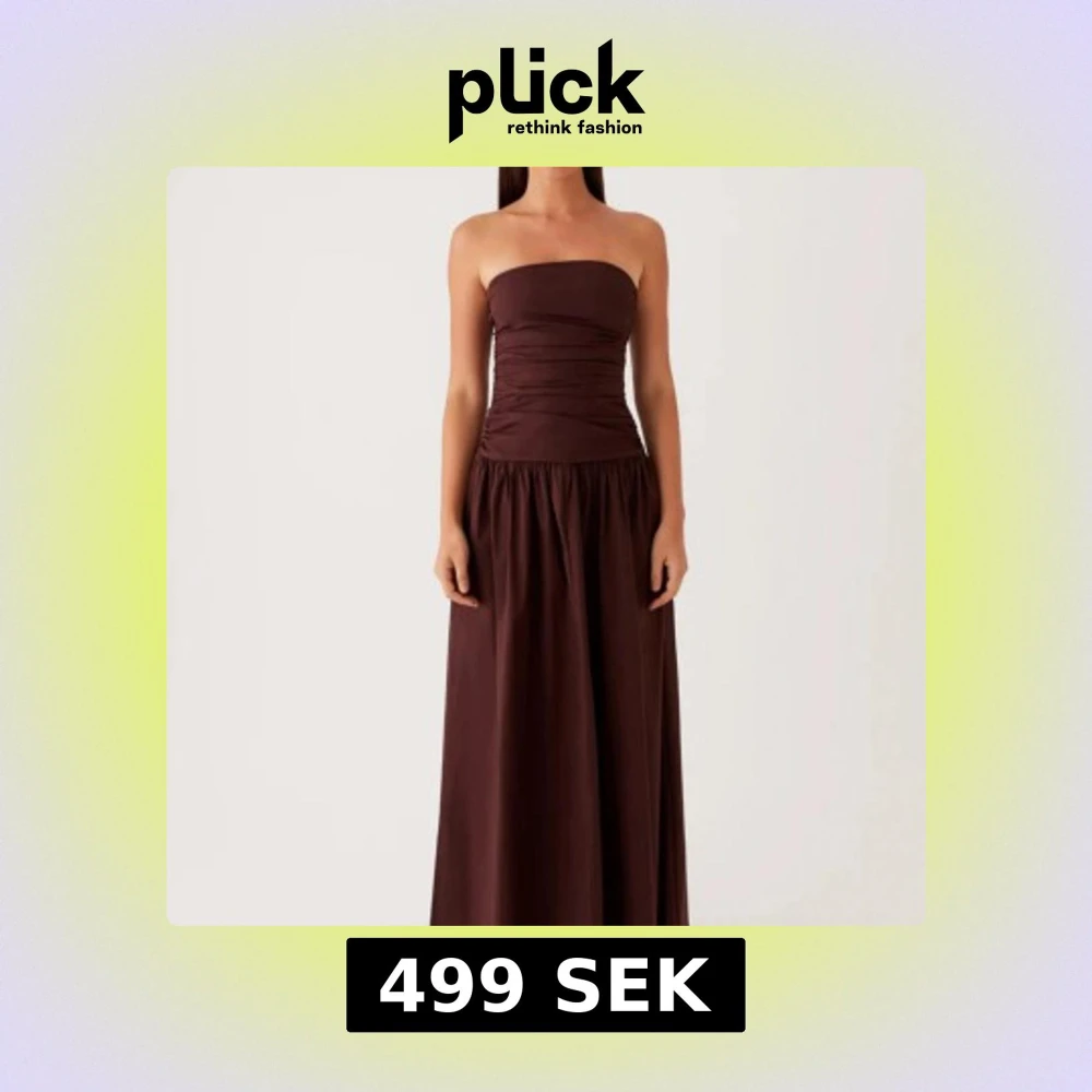 Säljer en stilren mörkbrun axelbandslös långklänning med rynkade detaljer över bysten och midjan. Klänningen har en figurnära överdel och ett utsvängt långt kjolparti. Perfekt för dig som vill ha en elegant och enkel look. Har använt den bara en gång.