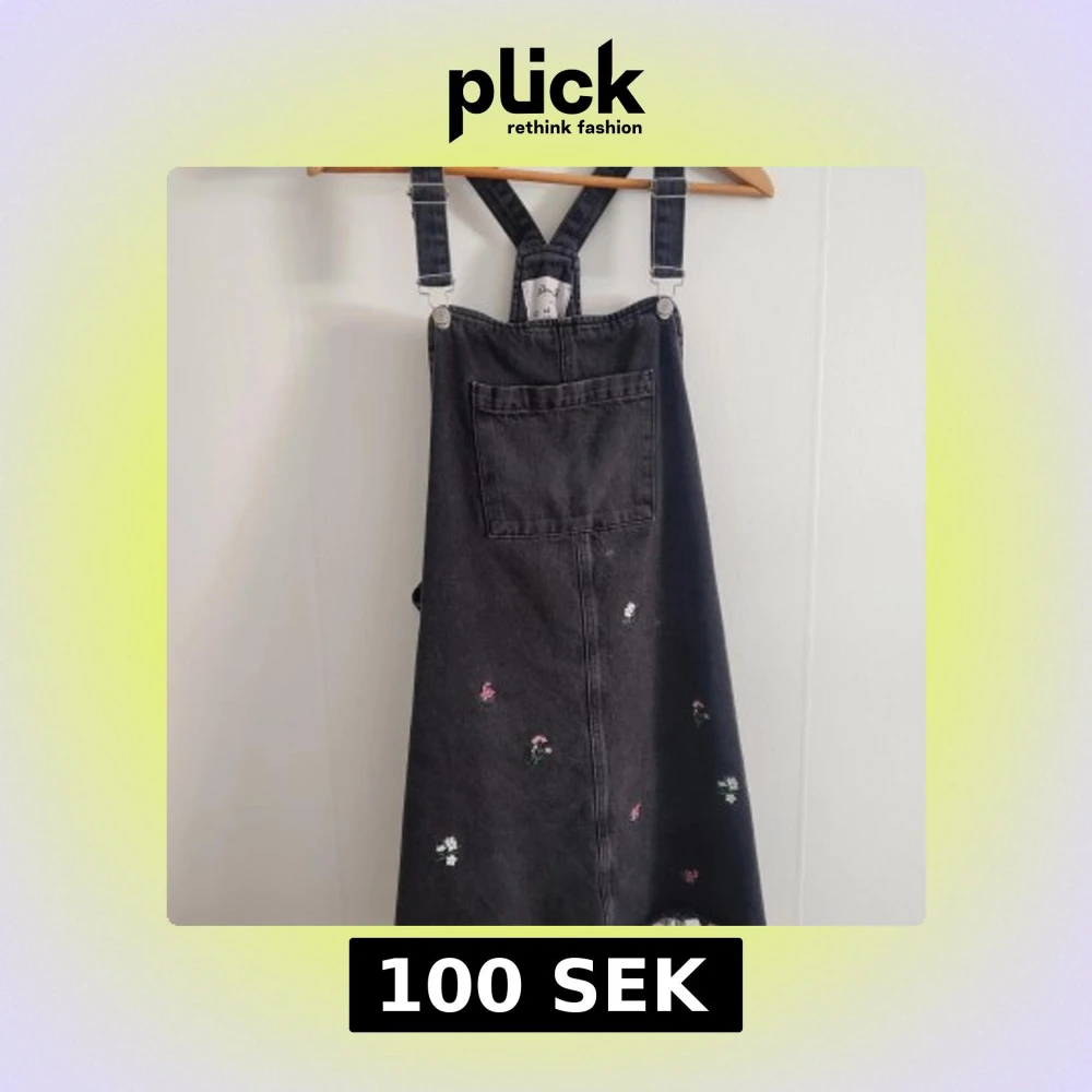 Trendig svart jeansklänning med justerbara axelband och broderade blommor i olika färger. Klänningen har en stor ficka framtill och en avslappnad passform.